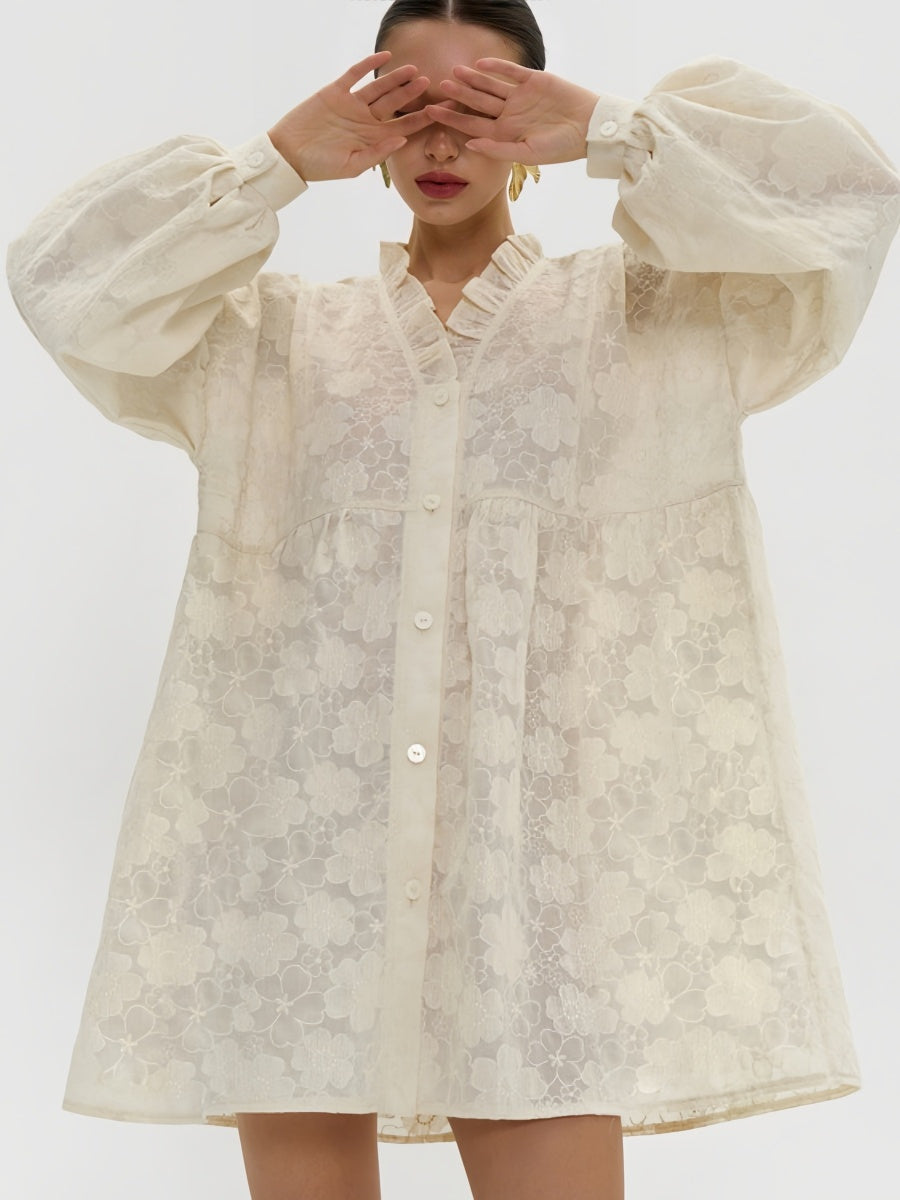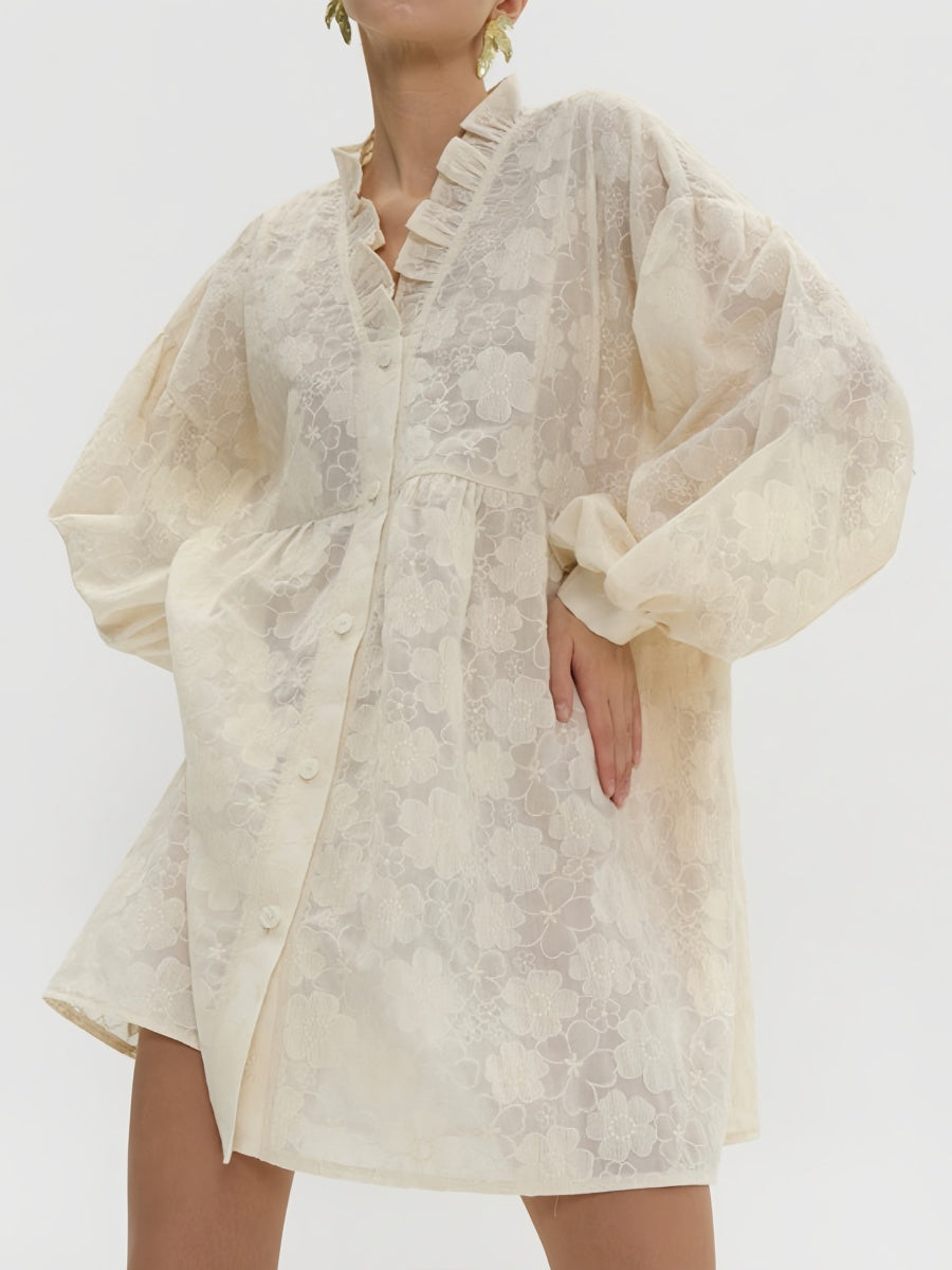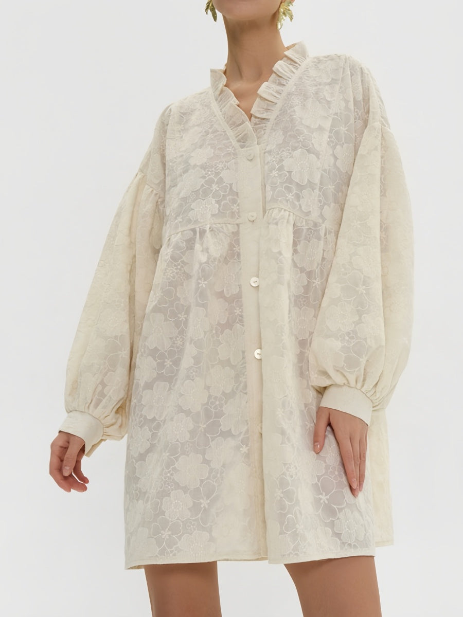 Rahat kesimi ve zarif çiçek işlemeleriyle dikkat çeken bu gömlek elbise, volan detayları ve puff kollarıyla bohem bir şıklık sunar. Günlük gezilerden tatil planlarına kadar her anınıza renk katar.