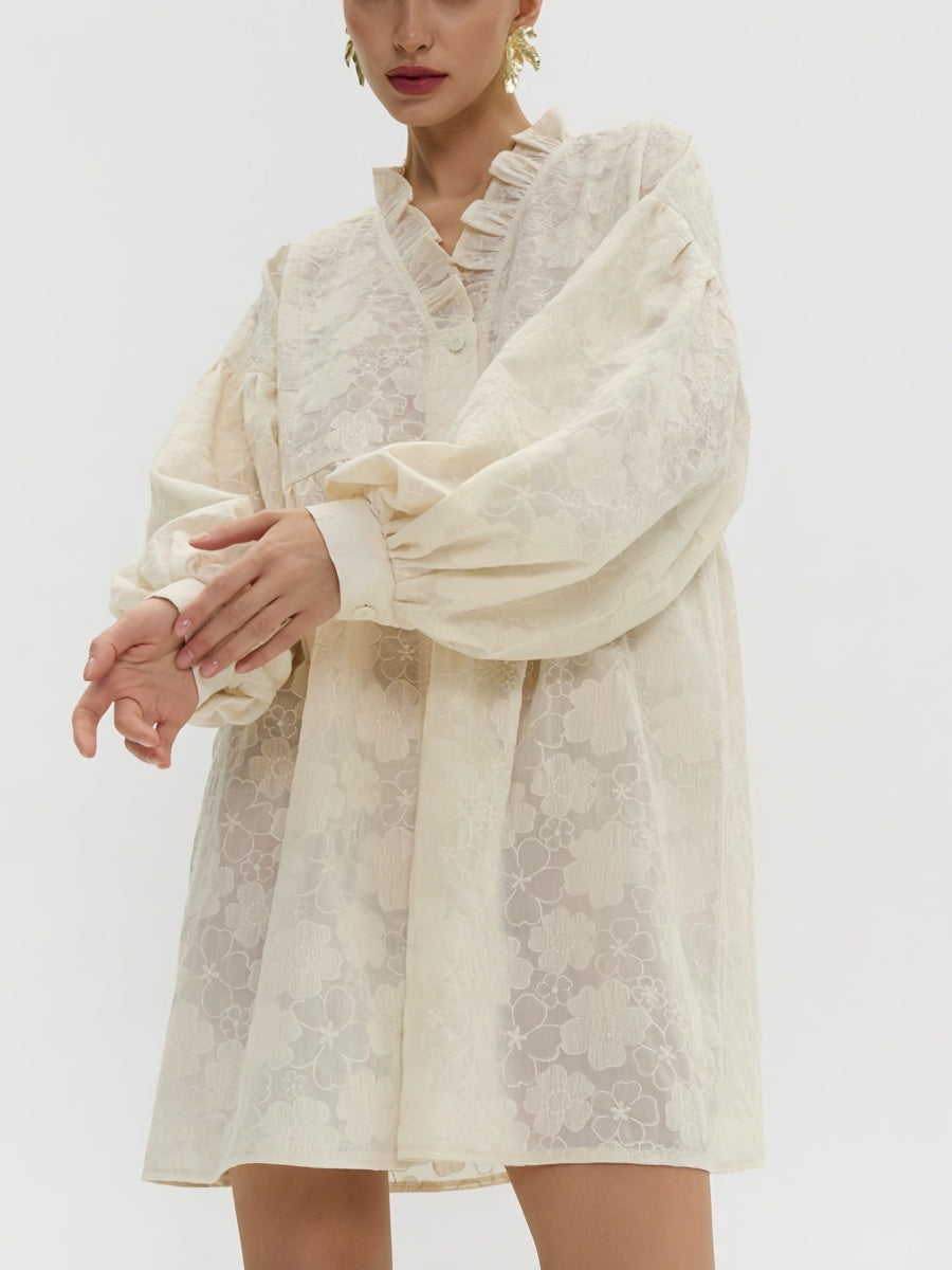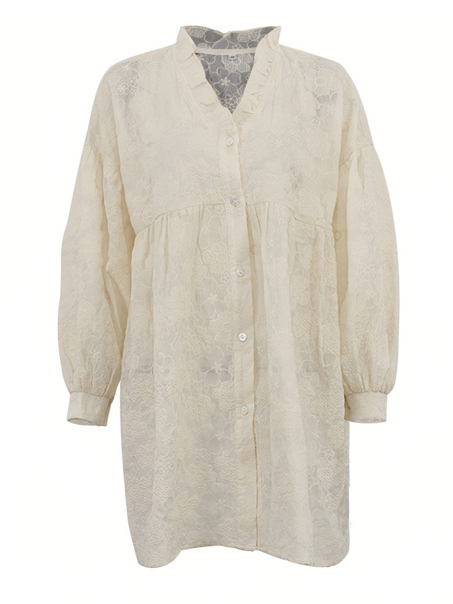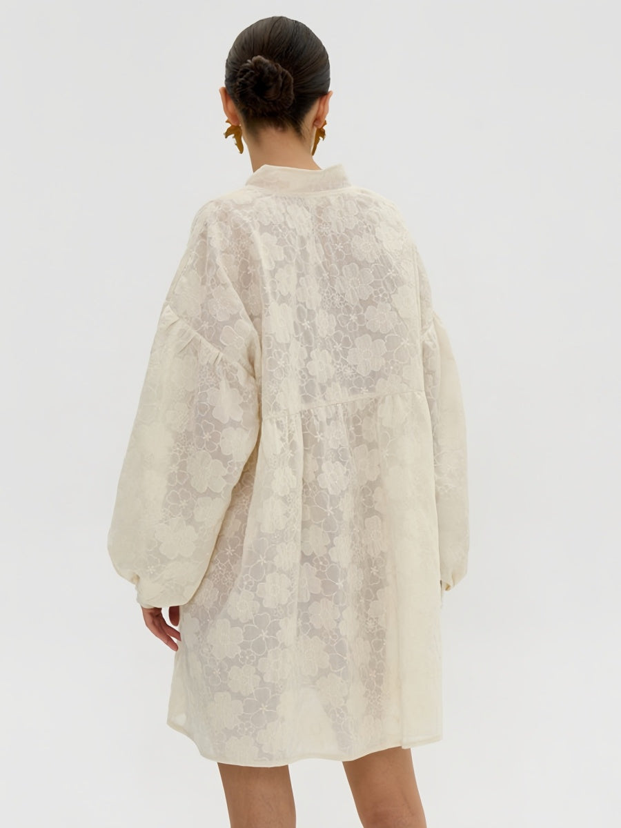 Rahat kesimi ve zarif çiçek işlemeleriyle dikkat çeken bu gömlek elbise, volan detayları ve puff kollarıyla bohem bir şıklık sunar. Günlük gezilerden tatil planlarına kadar her anınıza renk katar.