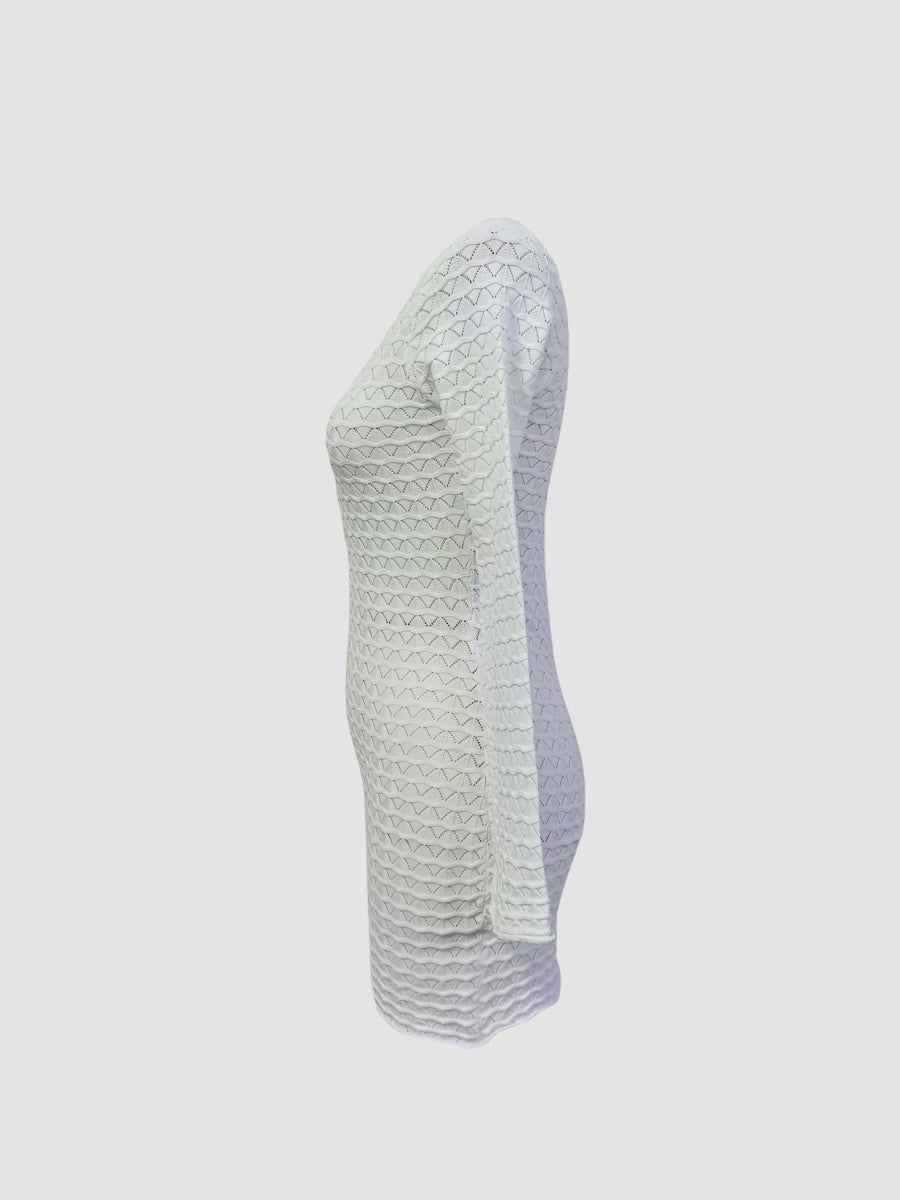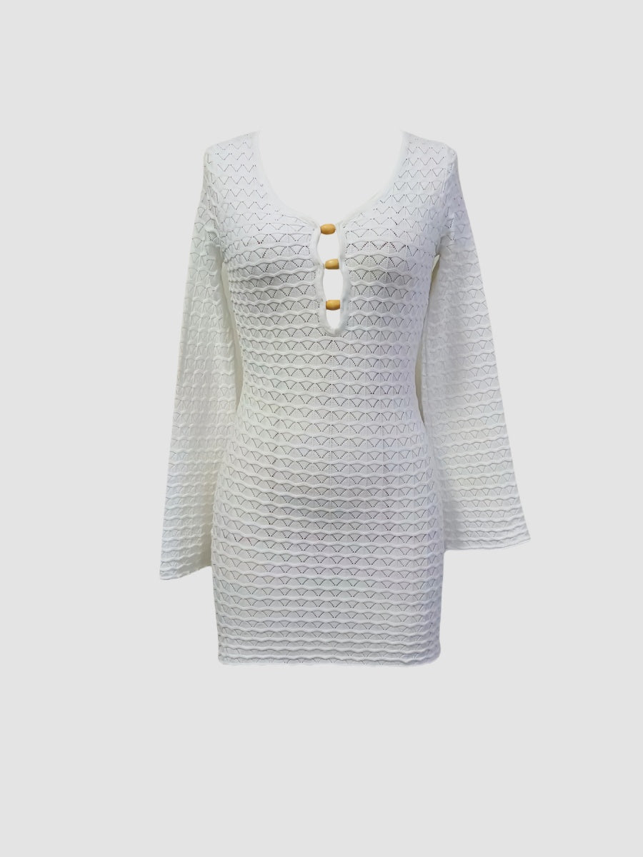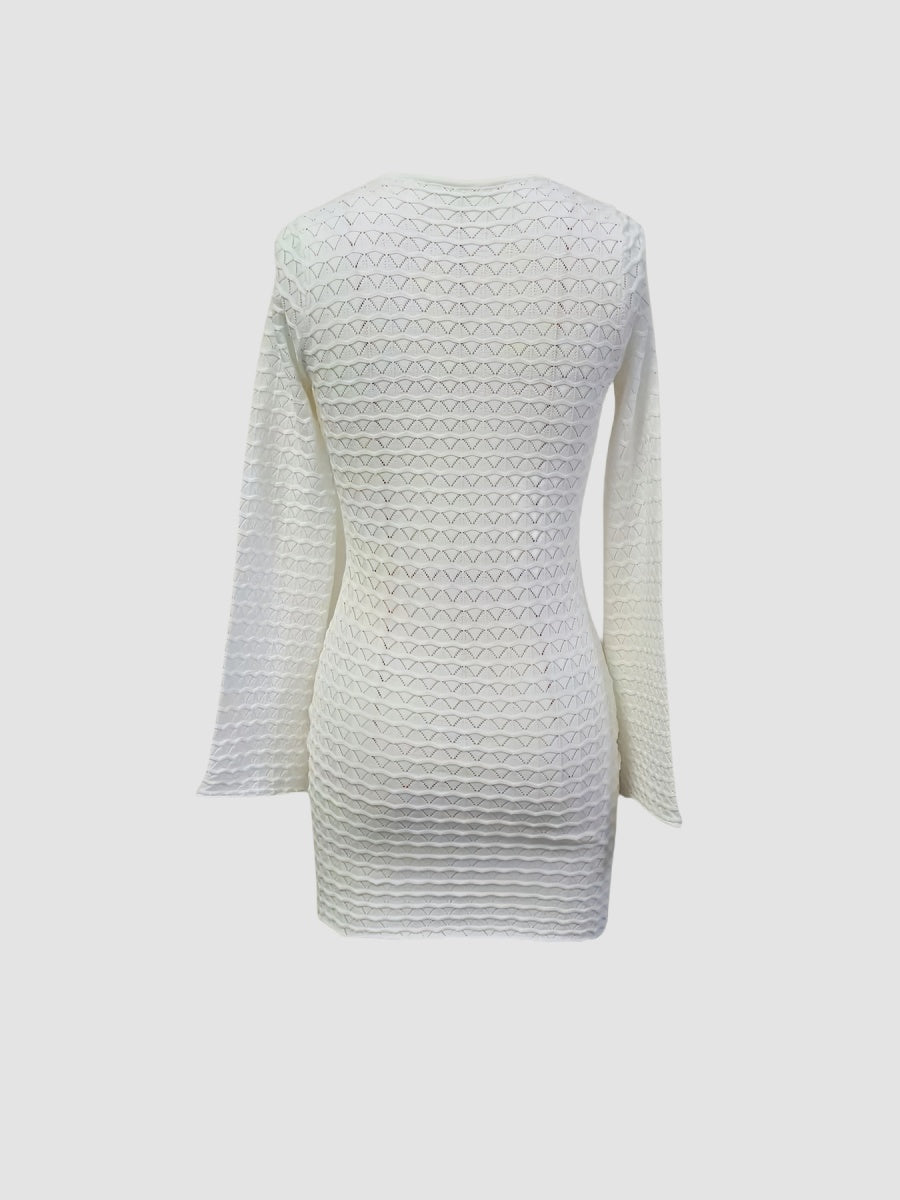 Zarif kroşe dokusu ve anahtar yaka dekoltesiyle dikkat çeken bu mini elbise, vücudu saran formuyla feminen bir stil sunar. Günlük şıklık ya da akşam buluşmaları için cesur ve sofistike bir tercih.