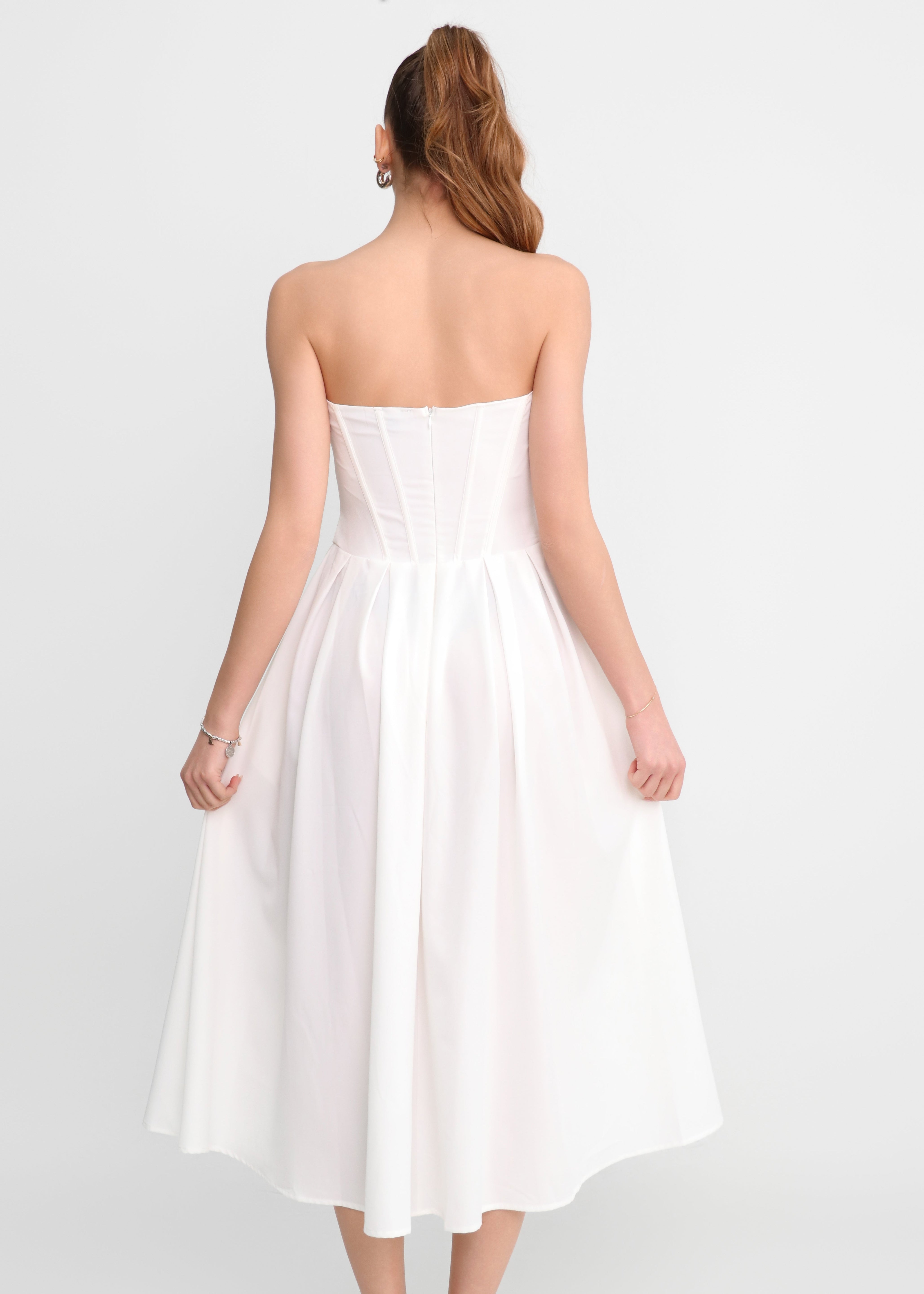 Form: Korsajlı üst, bel vurgulu midi elbise