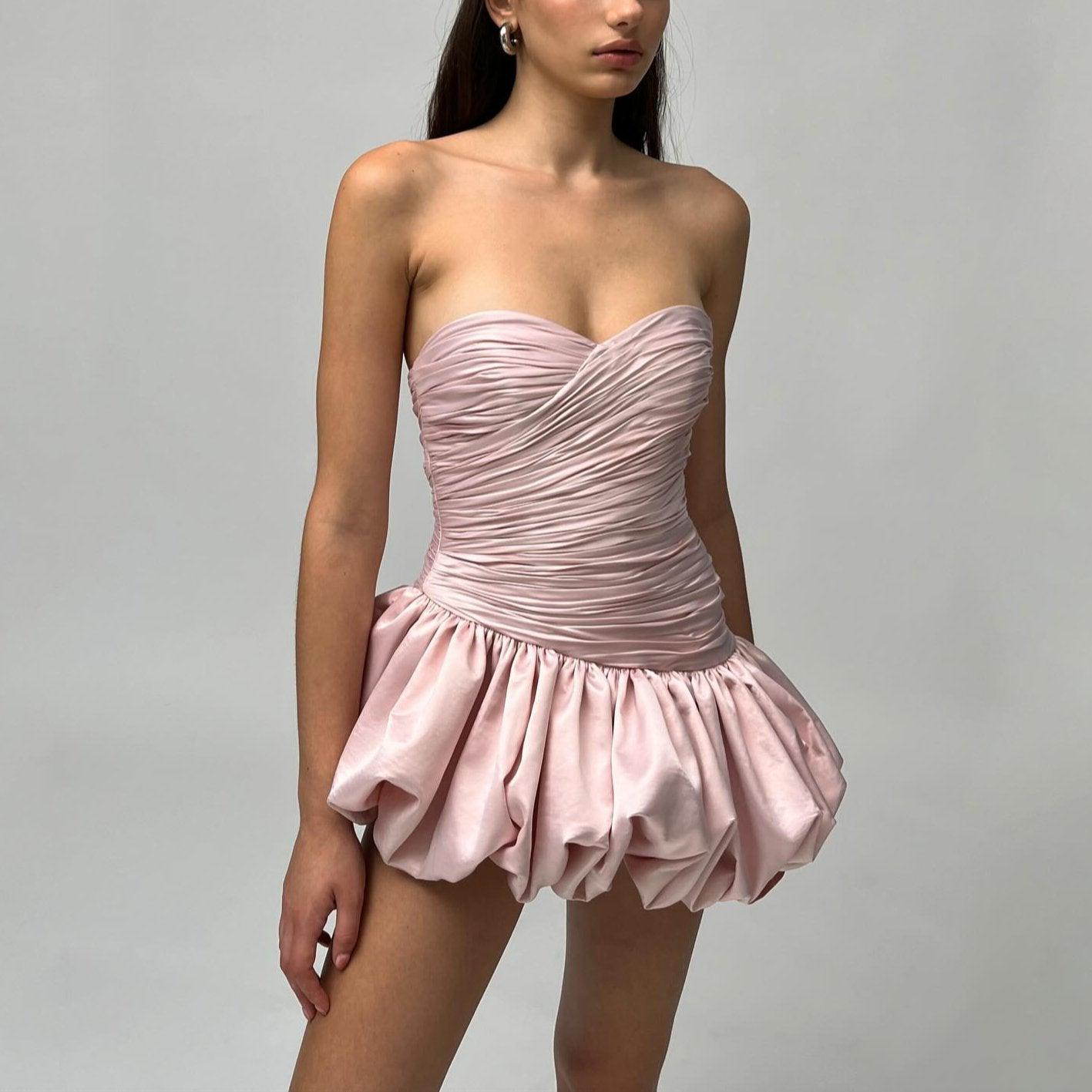 Drapeli katmanları ve hacimli formuyla iddialı bir siluet sunan bu mini elbise, özel anlarda tüm bakışları üzerinizde toplar. Yan kısımdaki gizli fermuar, kusursuz bir görünüm sağlarken, heykelsi büzgüler modern dokunuş katar.