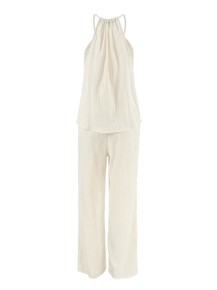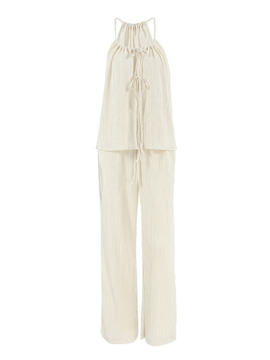 Zarafetle rahatlığı bir araya getiren Önü Bağlamalı Geniş Paça Pantolon Takımı ile tarzınızı dönüştürün. İnce askılı üst kısmı kadınsı bir dokunuş sunarken, geniş paça pantolonlar uzun ve şık bir siluet yaratır.