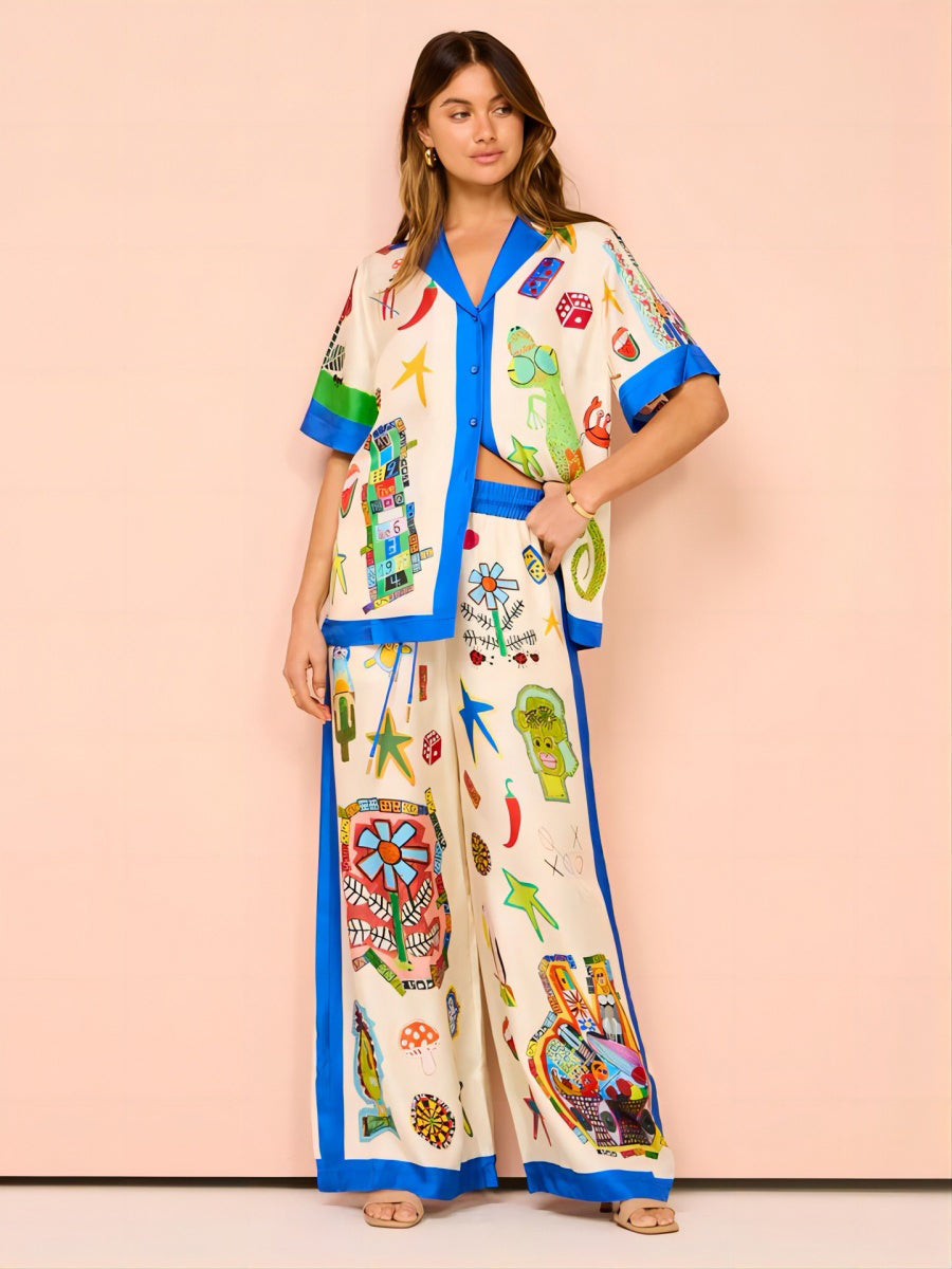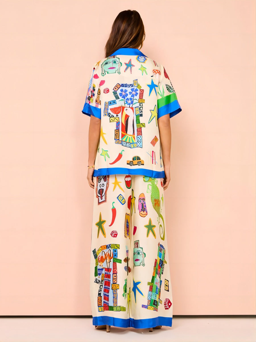 Canlı renkler ve eğlenceli desenlerle tasarlanan bu kısa kollu pantolon takımı, rahat kesimiyle gün boyu konfor sunarken stilinize enerjik bir dokunuş katar. Farklı ve dikkat çekici görünmek isteyenler için birebir.