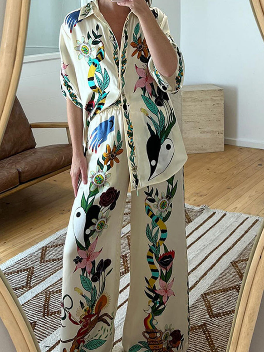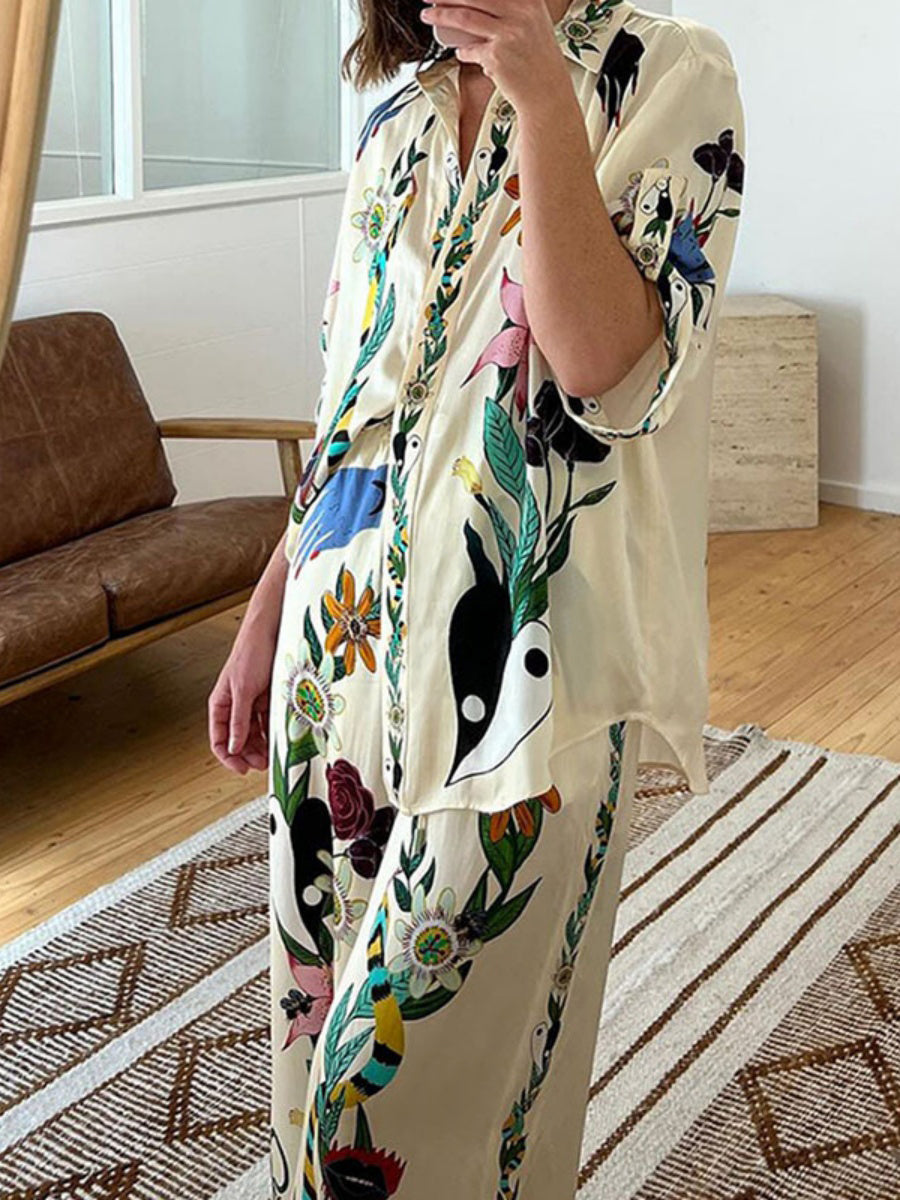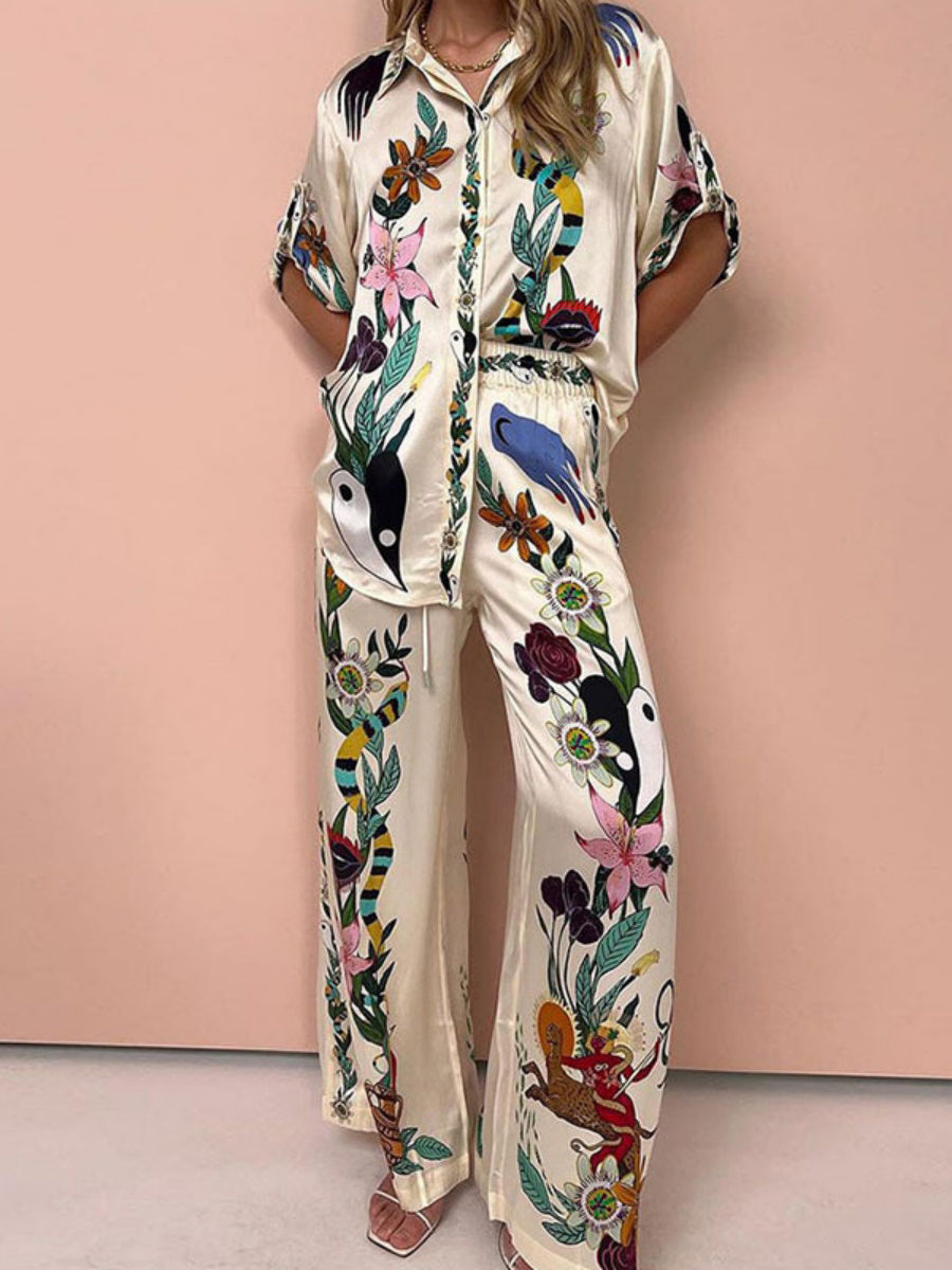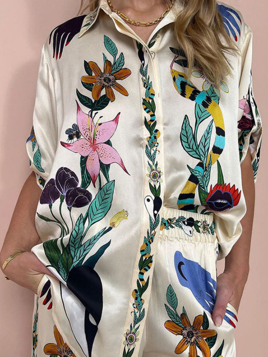 Botanik çiçek desenleriyle hareketlenen bu kısa kollu pantolon takımı, şıklığı ve konforu bir arada sunar. Rahat kesimiyle her ortamda stil sahibi bir görünüm yaratır.