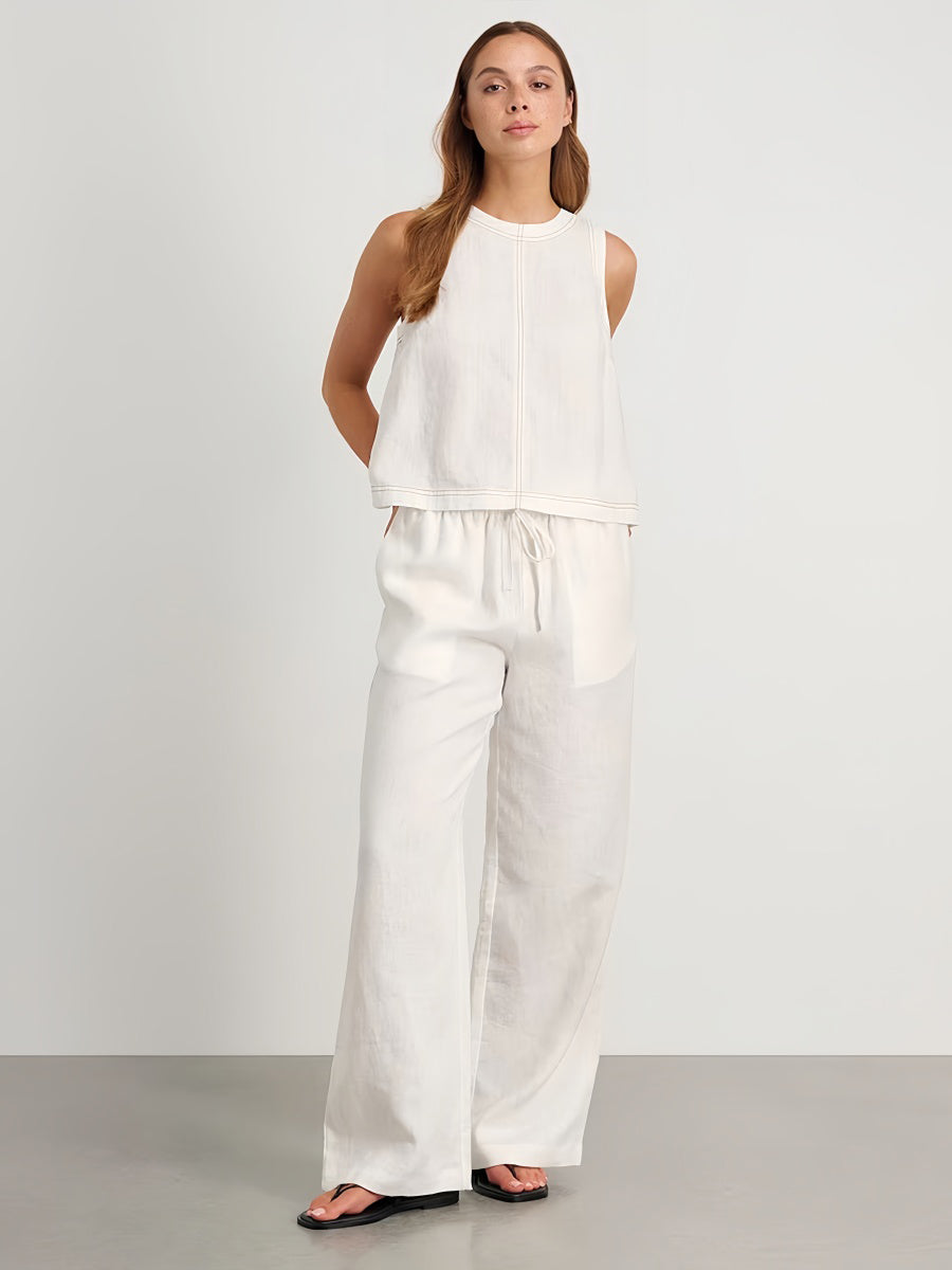 Gardırobunuza şıklık katacak bu Kolsuz, Arkası Yırtmaçlı Geniş Paça Pantolon Takımı ile tanışın. Kolsuz üst rahatlık sağlarken, arkadaki yırtmaç beklenmedik bir hareketlilik ve zarafet katar. Akıcı geniş paça pantolonlar ise göz alıcı bir siluet yaratır.