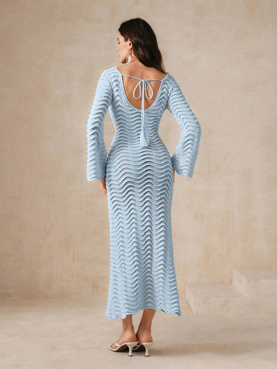 Zarif kroşe dokusu, metal detayları ve cesur sırt dekoltesiyle büyüleyici bir siluet sunan bu maksi elbise, güneşten ilham alan stilinizi öne çıkarır. Tatil şıklığının vazgeçilmez parçası olmaya aday.