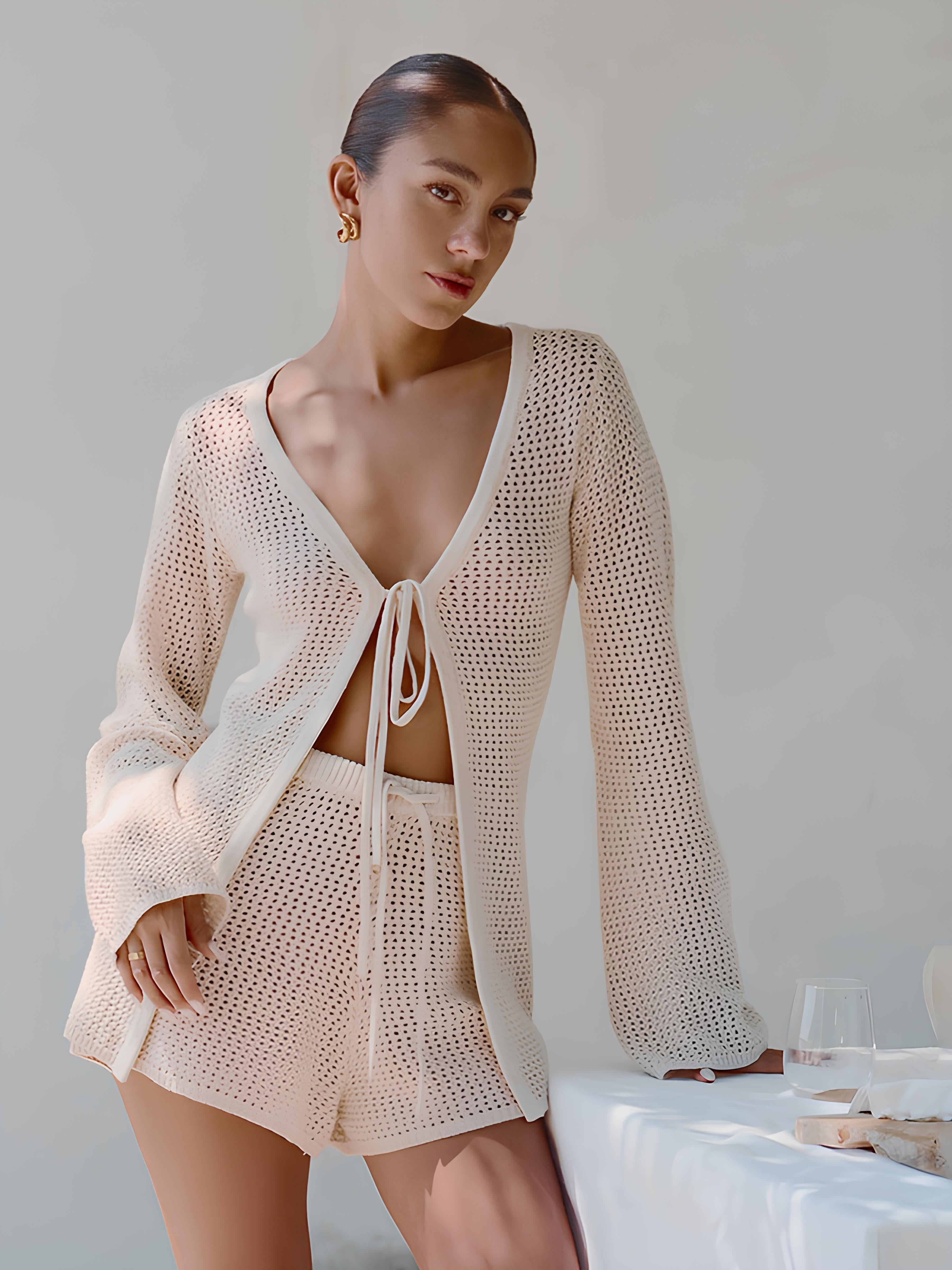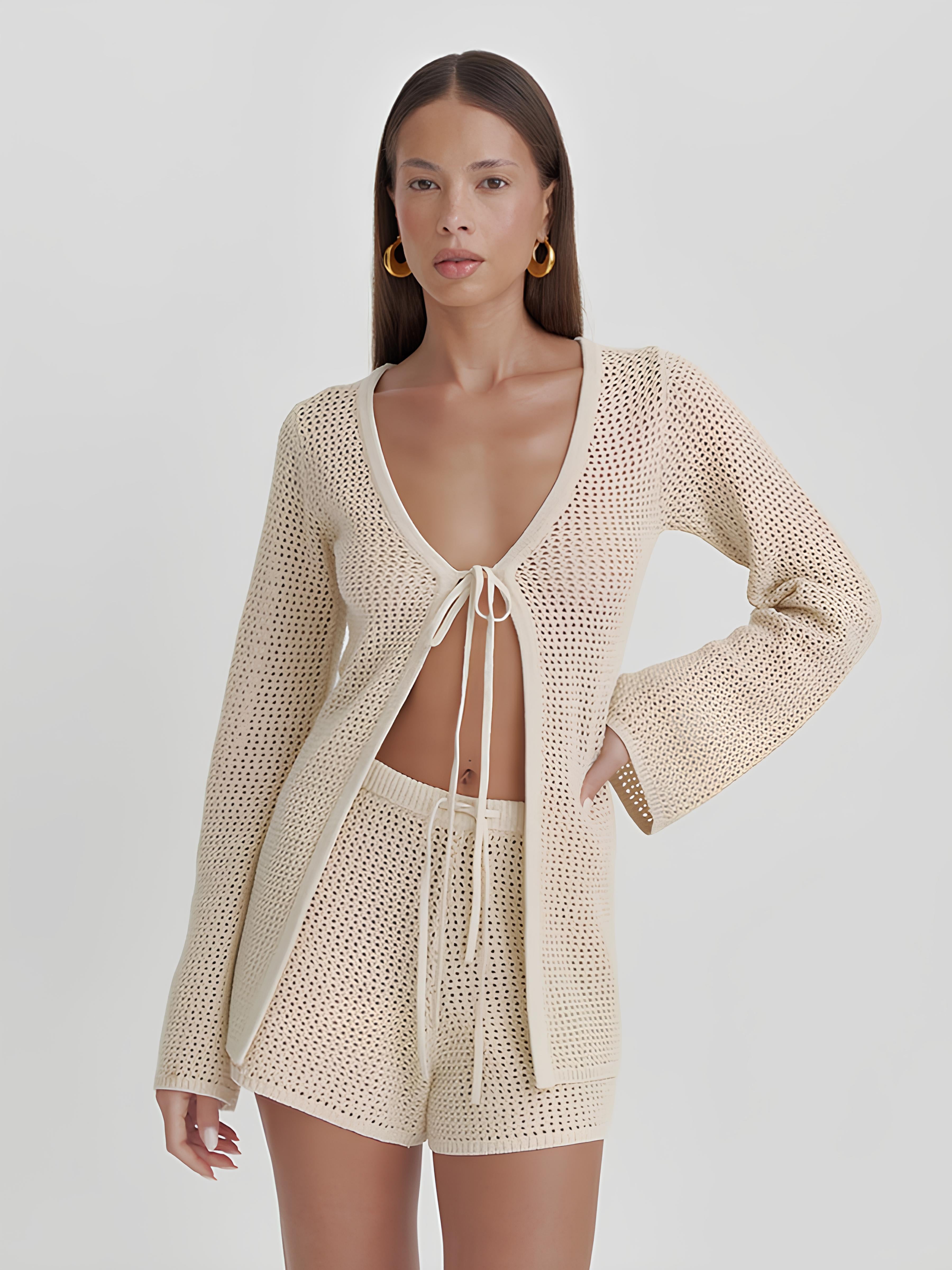 Sade tasarımına ajur detaylarıyla hareket katan bu uzun kollu şort takımı, hem evde rahat etmek hem dışarıda şık görünmek isteyenler için ideal. V yaka kesimi ve bağlamalı ön detayı ile feminen ve zarif bir stil sunar.