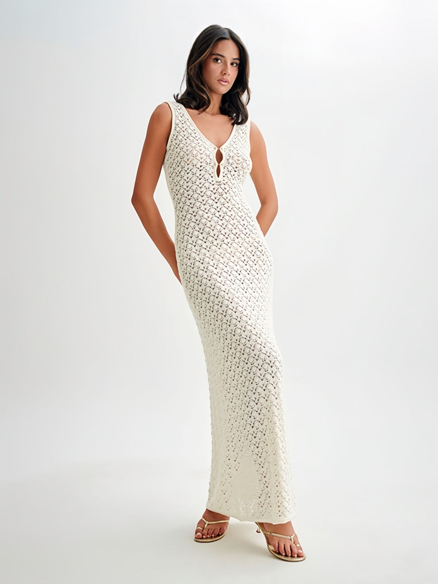 V yaka kesimi ve zarif metal detaylarıyla dikkat çeken bu kolsuz maksi elbise, sade tasarımına modern ve iddialı bir dokunuş katıyor. Günlük şıklıktan tatil akşamlarına kadar özgüvenli bir stil sunar.