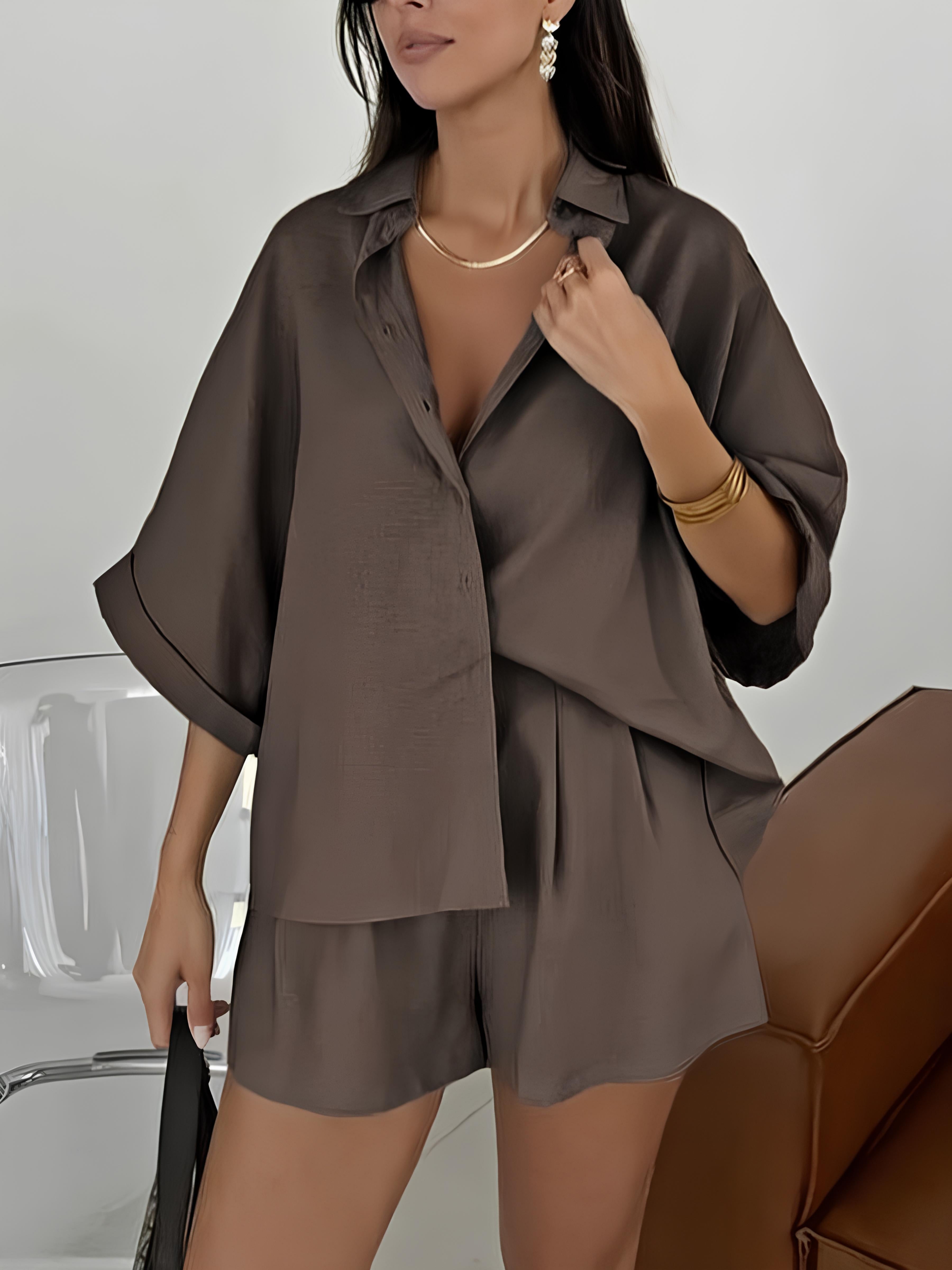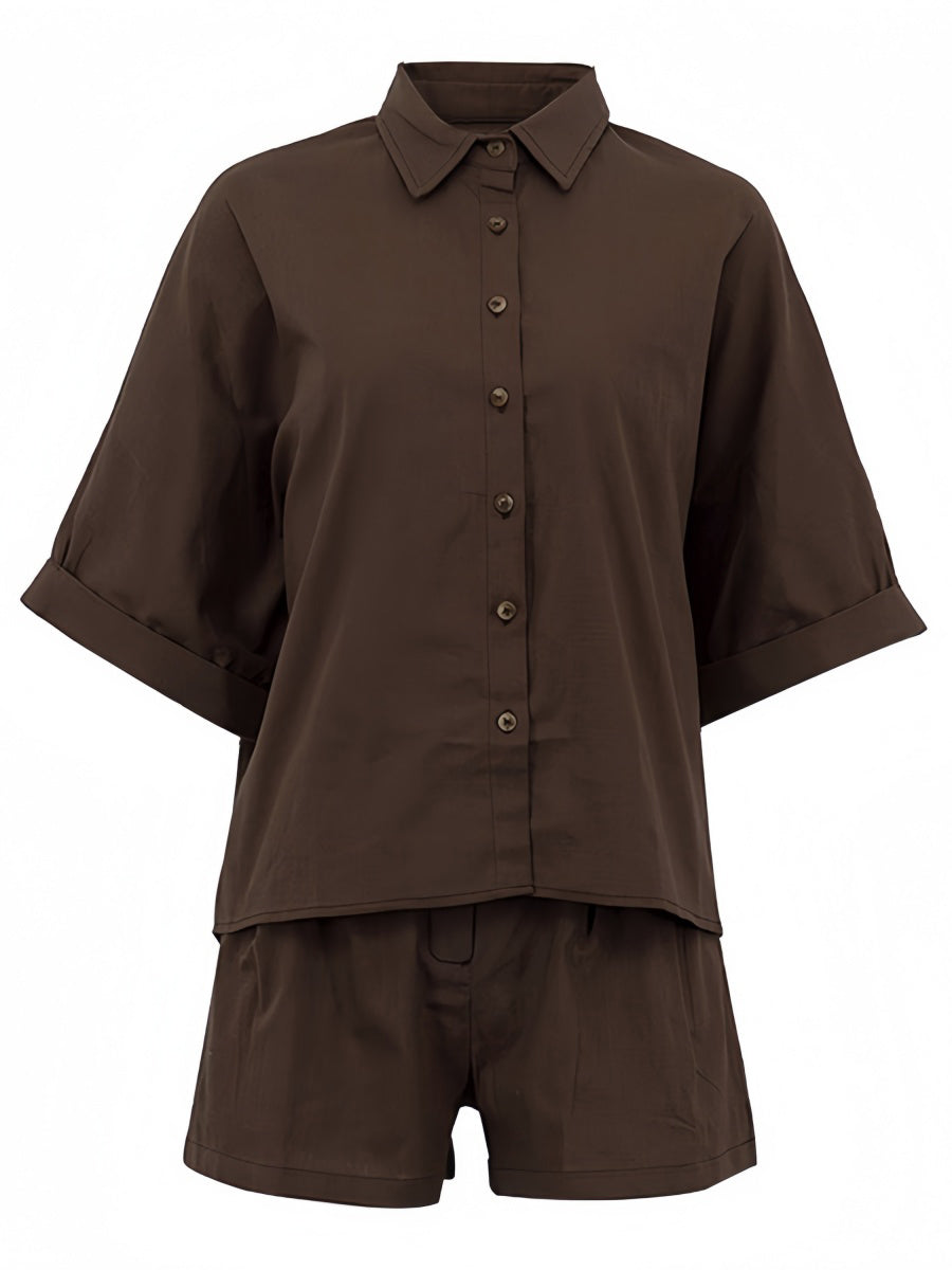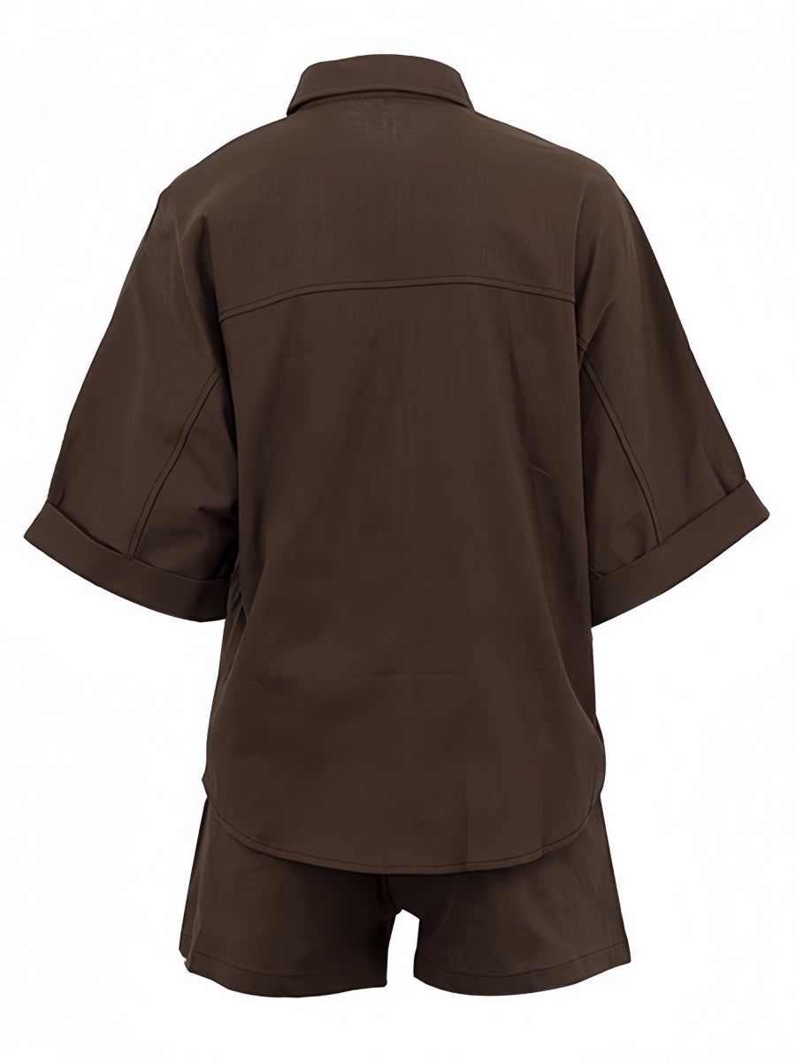 Gardırobunuzu bu kahverengi turn-down yaka ve düğme detaylı şort takımıyla güncelleyin. Rahatlığı ve şıklığı bir arada sunan bu takım, hem evde dinlenirken hem de günlük dışarı çıkmalarda ideal bir seçimdir.