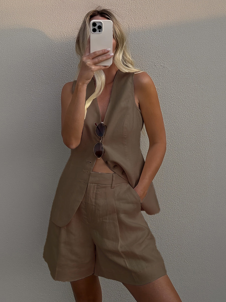 Sade renk ve dikkat çekici düğme detaylarıyla tasarlanmış bu yelekli şort takımı, konforlu kumaş karışımıyla gün boyu rahatlık sağlar. Minimalist ve şık görünümüyle iş ve günlük kullanıma uygun.