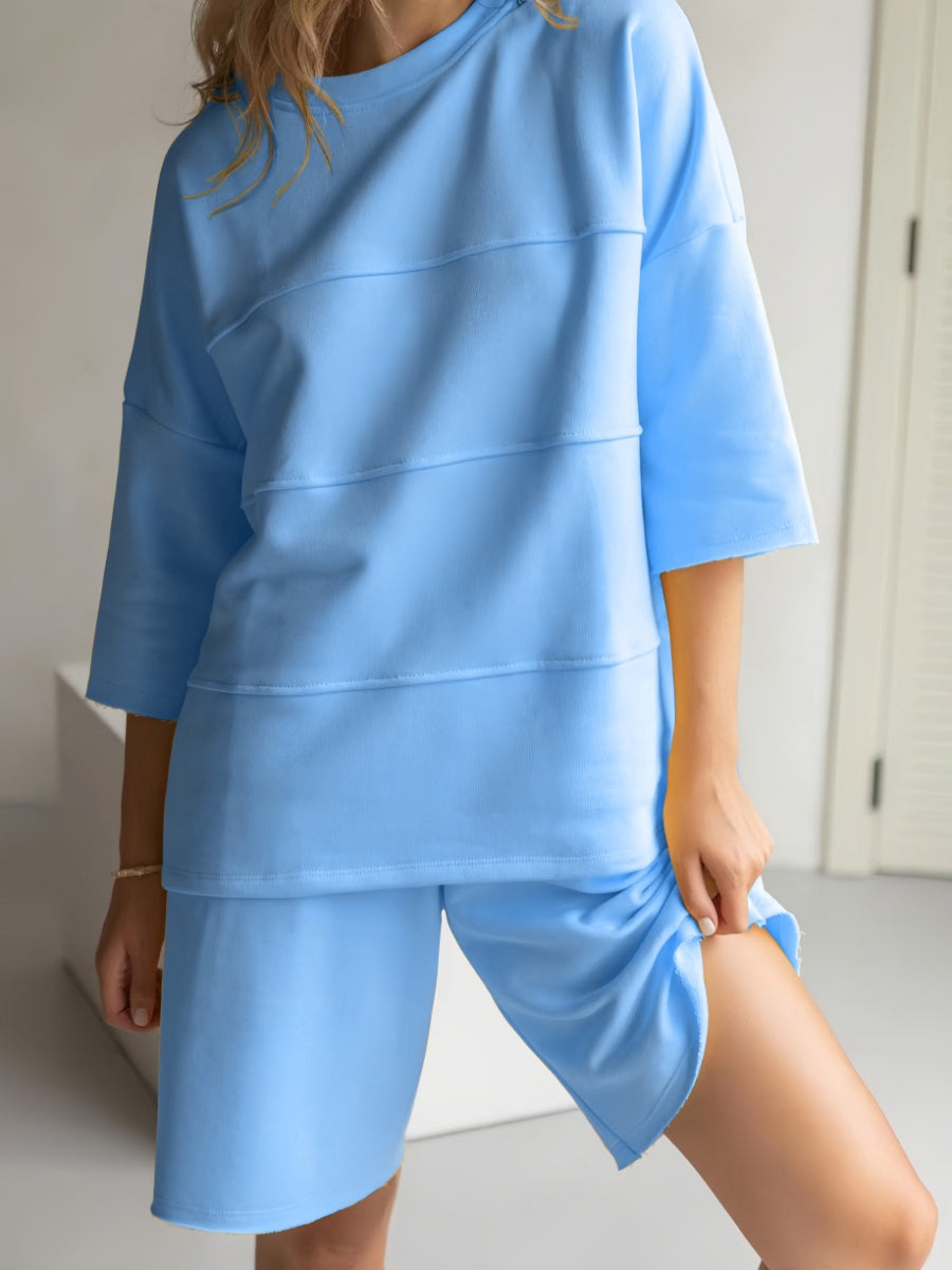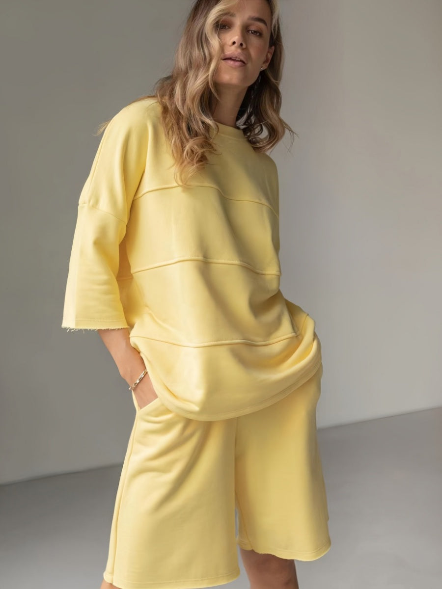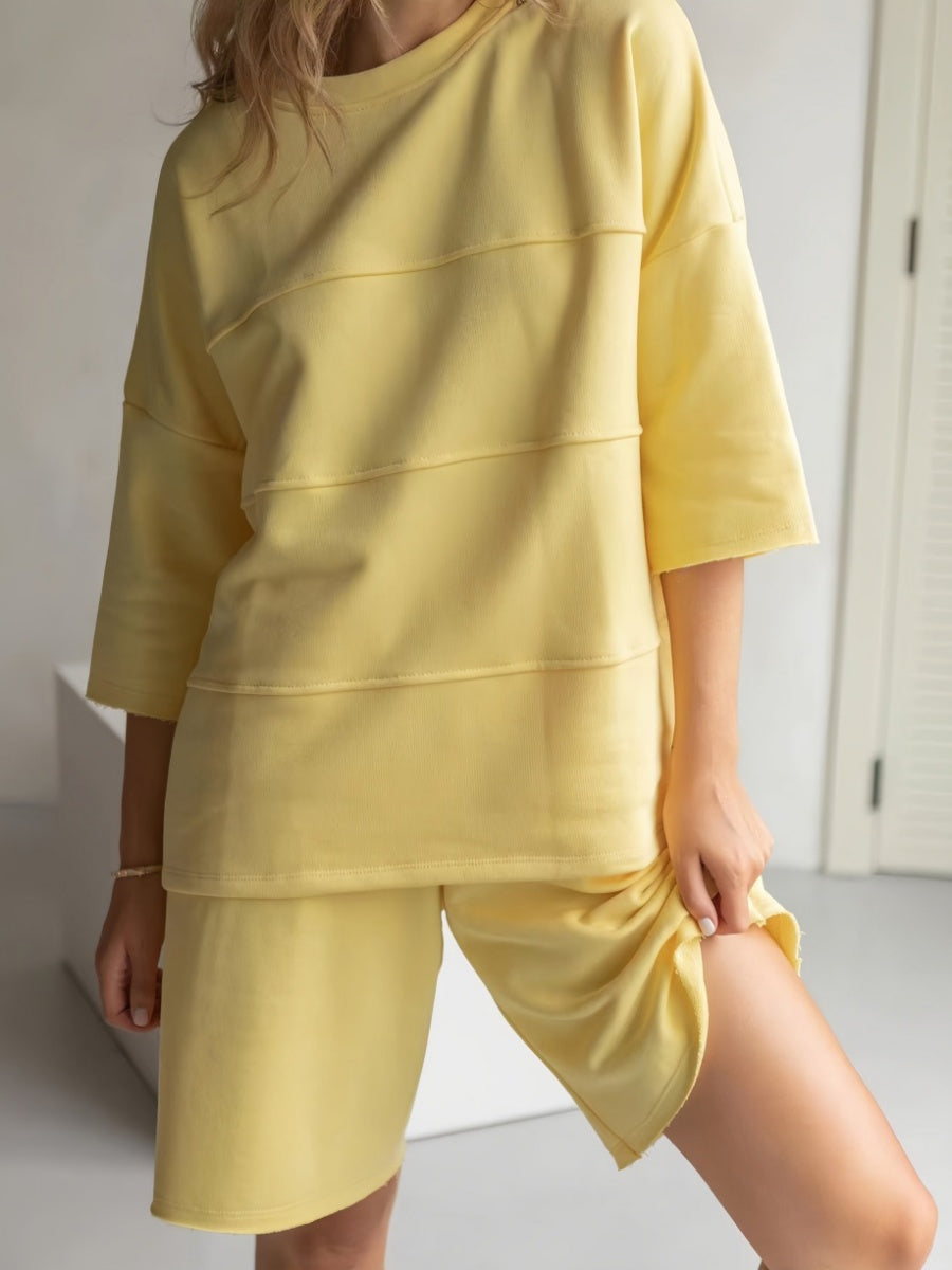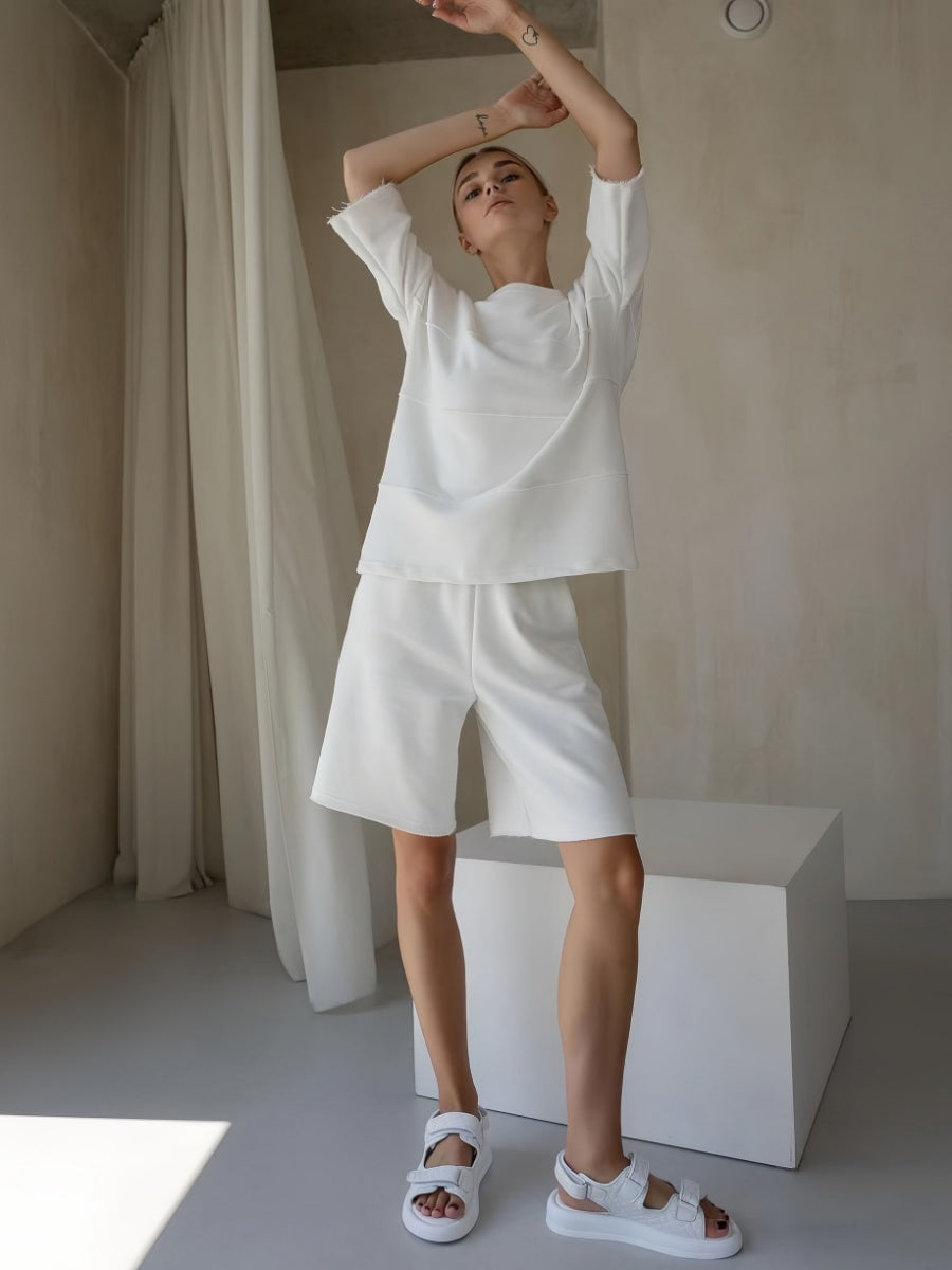 Yumuşak pamuk dokusu ve sade tasarımıyla konforu stille buluşturan bu dökümlü şort takımı, evde ya da dışarıda gün boyu rahatlık sunar. Minimal şıklığın vazgeçilmez parçası.