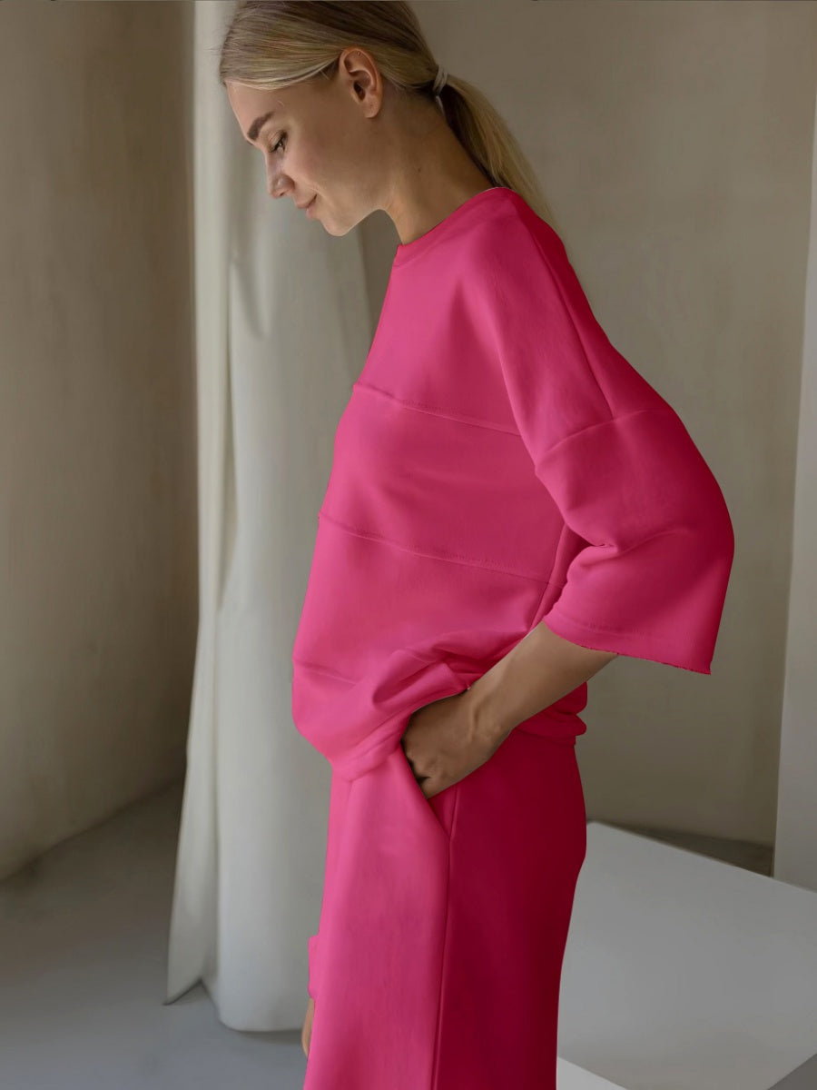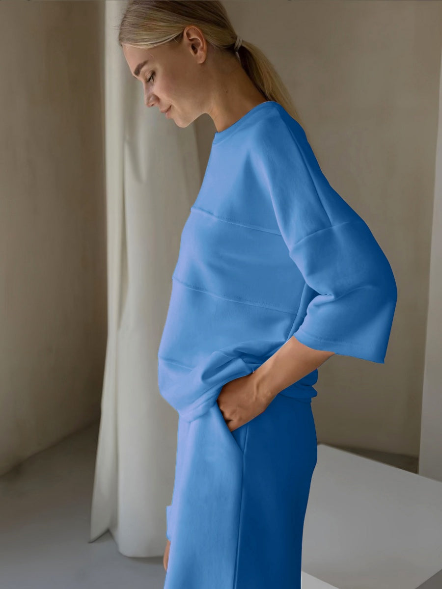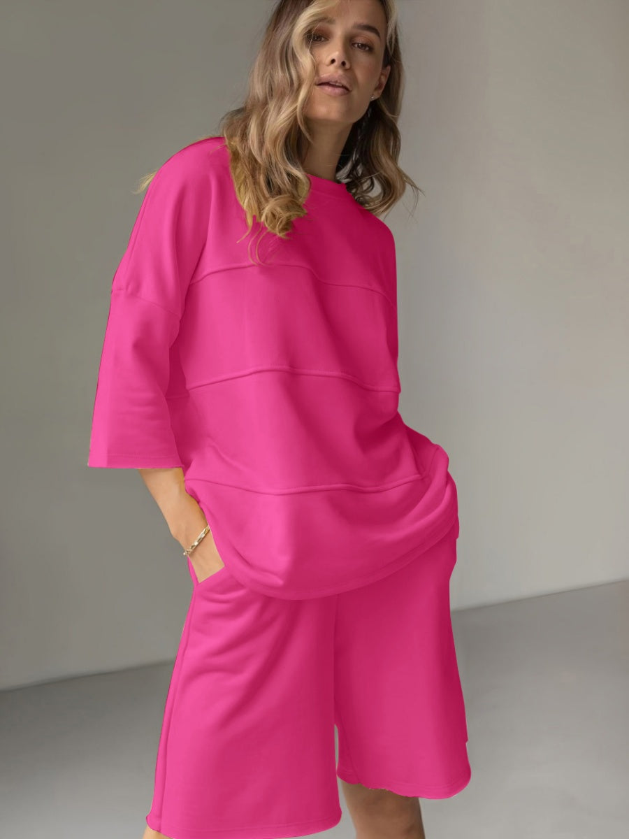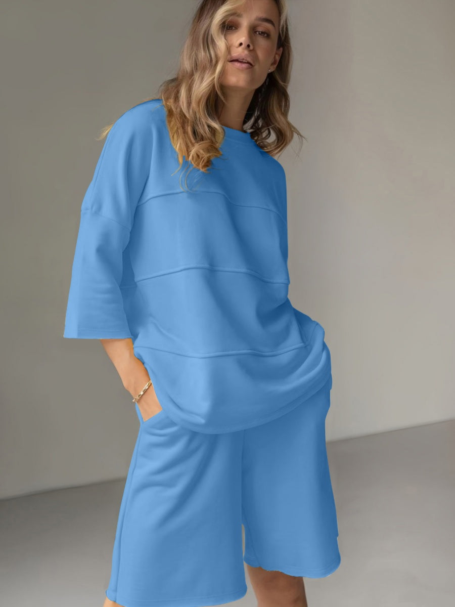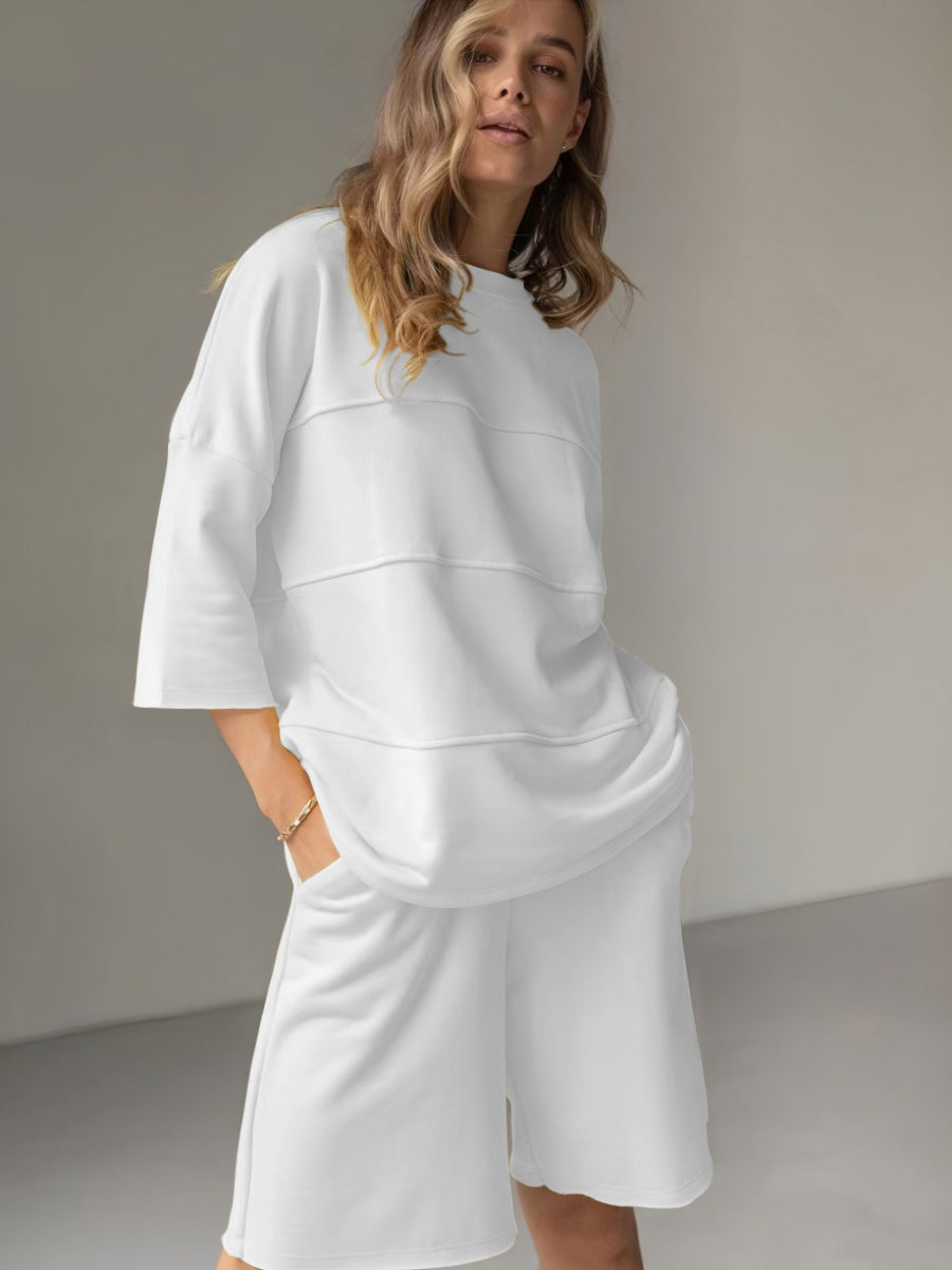 Yumuşak pamuk dokusu ve sade tasarımıyla konforu stille buluşturan bu dökümlü şort takımı, evde ya da dışarıda gün boyu rahatlık sunar. Minimal şıklığın vazgeçilmez parçası.