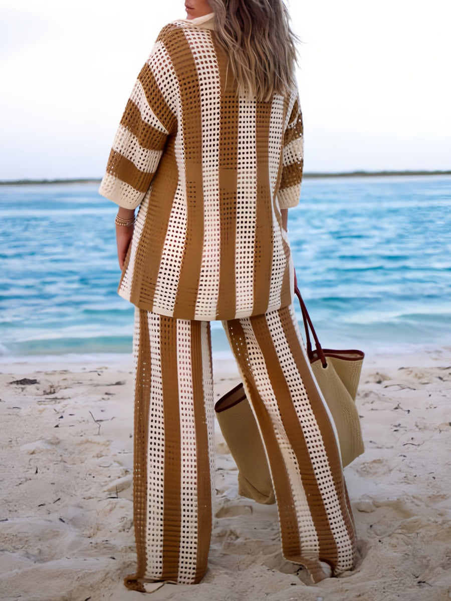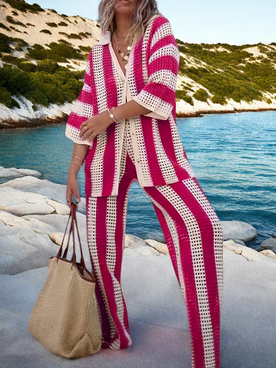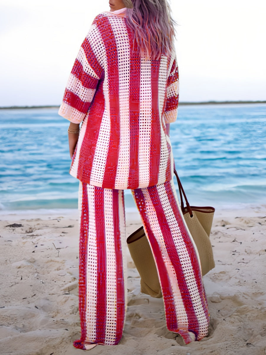 Kroşe işlemeleri ve çizgili deseniyle öne çıkan bu rahat pantolon takımı, sahil günlerinden festivallere kadar stilinizi tamamlar. V yaka üstü ve dökümlü kesimiyle hem özgür hem şık bir görünüm sunar.