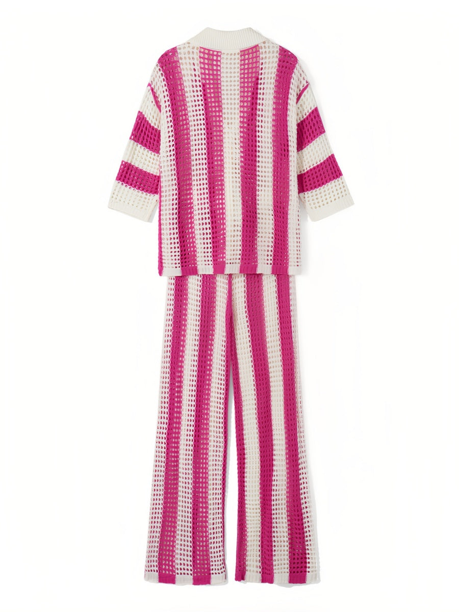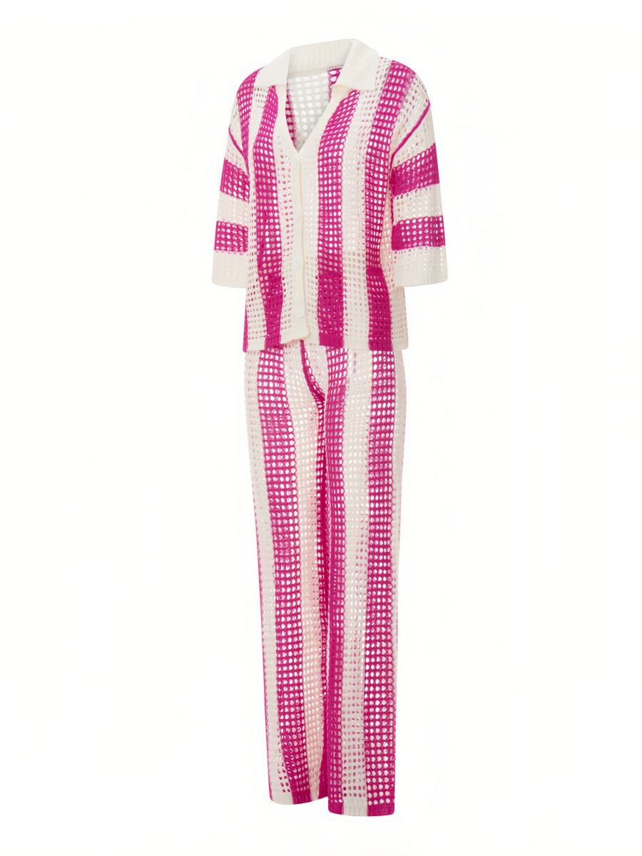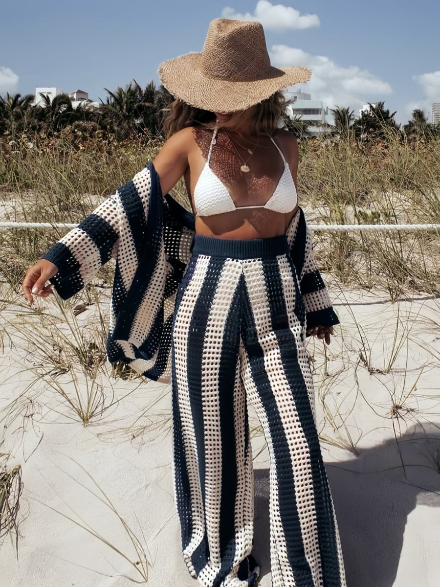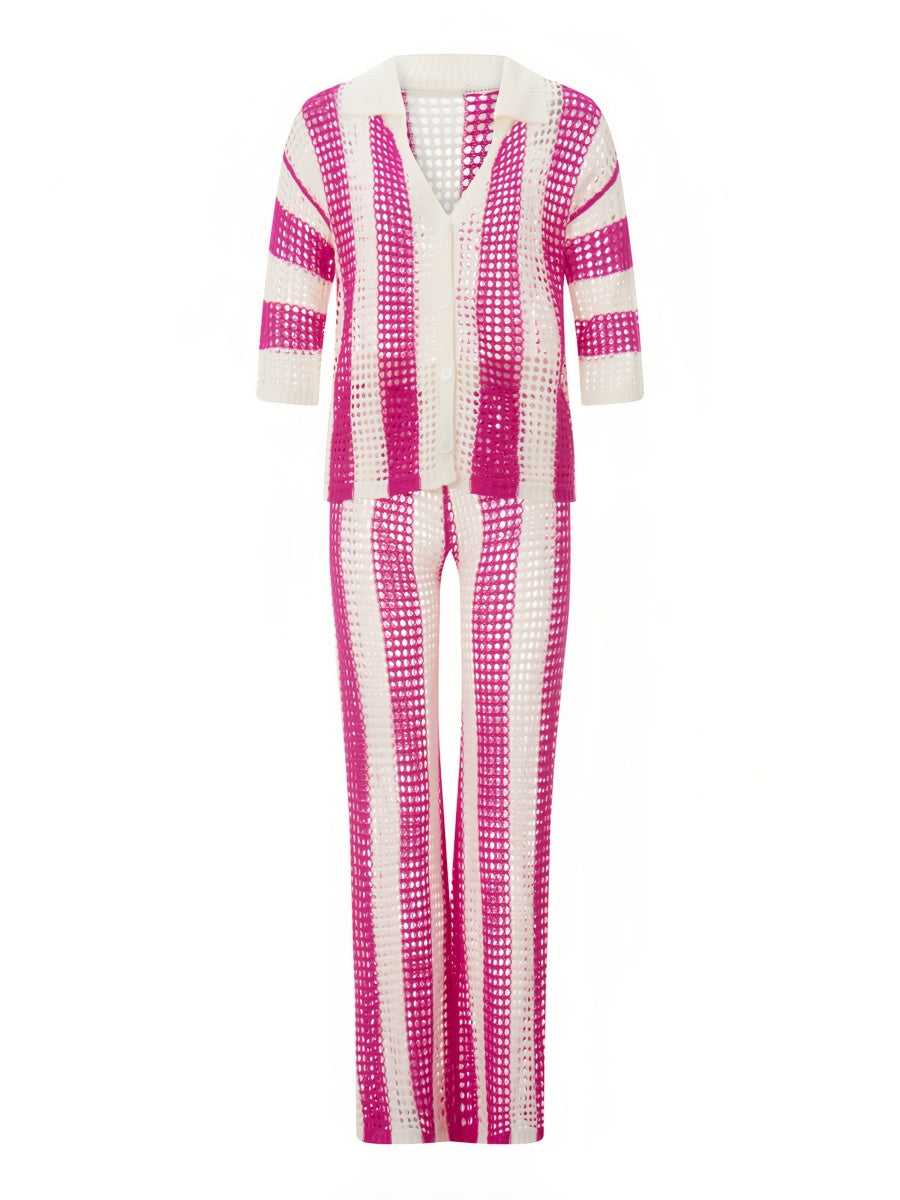 Kroşe işlemeleri ve çizgili deseniyle öne çıkan bu rahat pantolon takımı, sahil günlerinden festivallere kadar stilinizi tamamlar. V yaka üstü ve dökümlü kesimiyle hem özgür hem şık bir görünüm sunar.