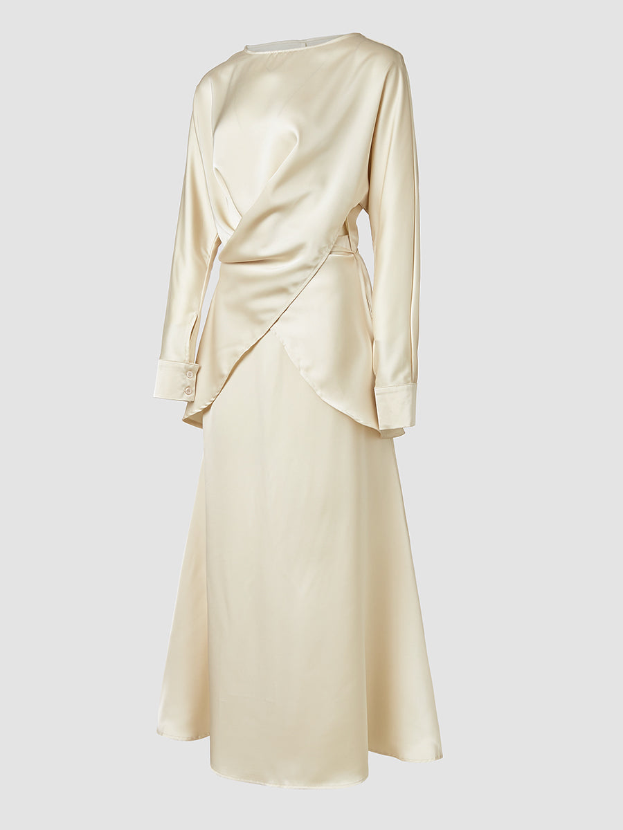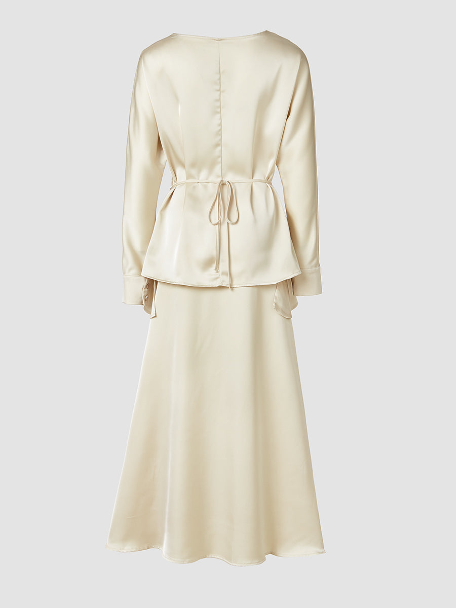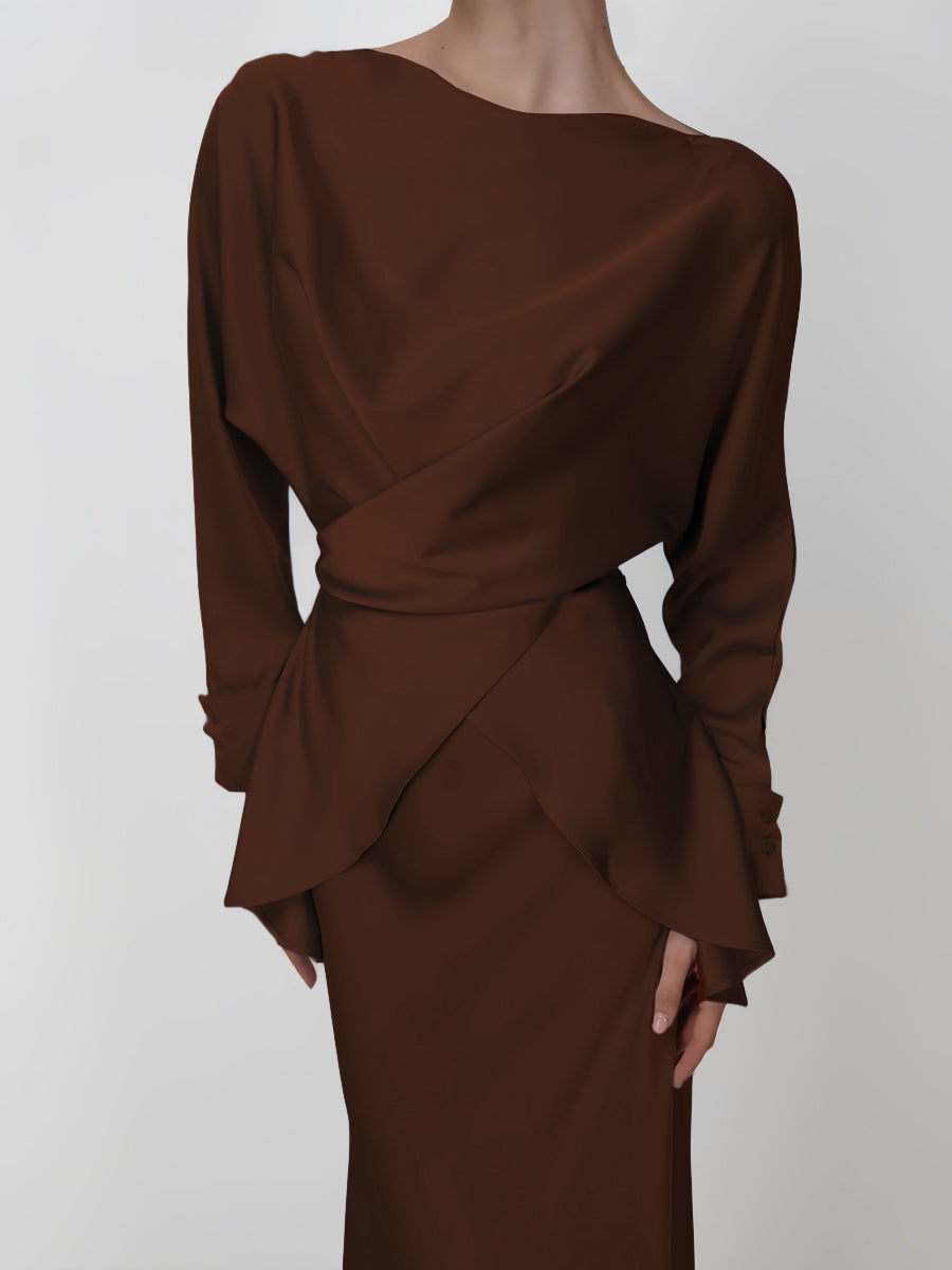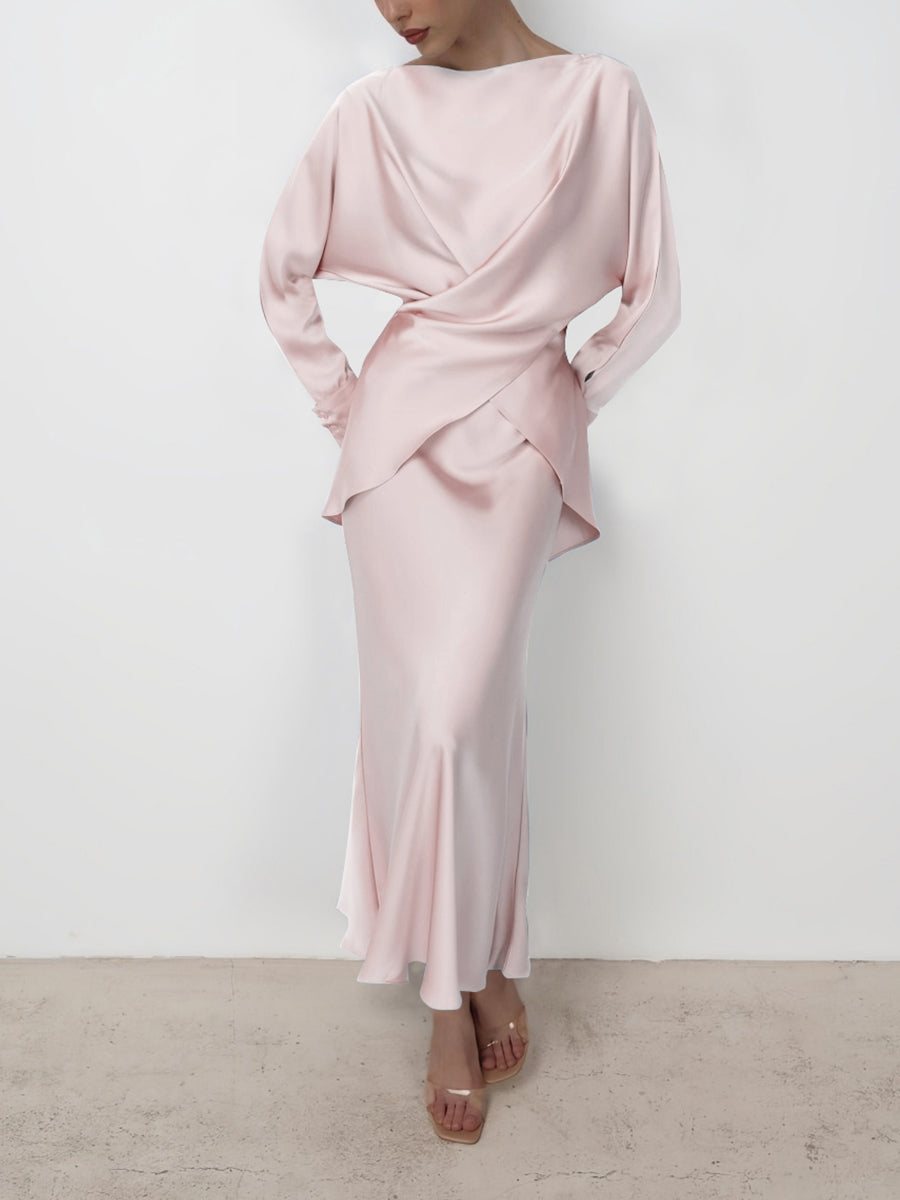 Düz renk, zarif kruvaze bağlama detayıyla fark yaratan bu uzun etek takımı; şık, minimal ve çok yönlü yapısıyla özel davetlerden iş ortamına kadar her anınıza uyum sağlar.