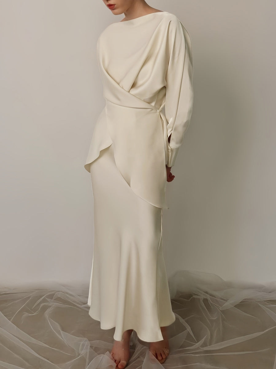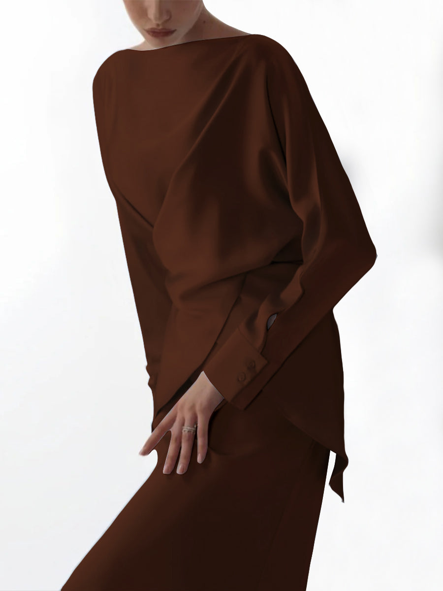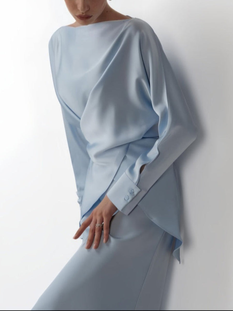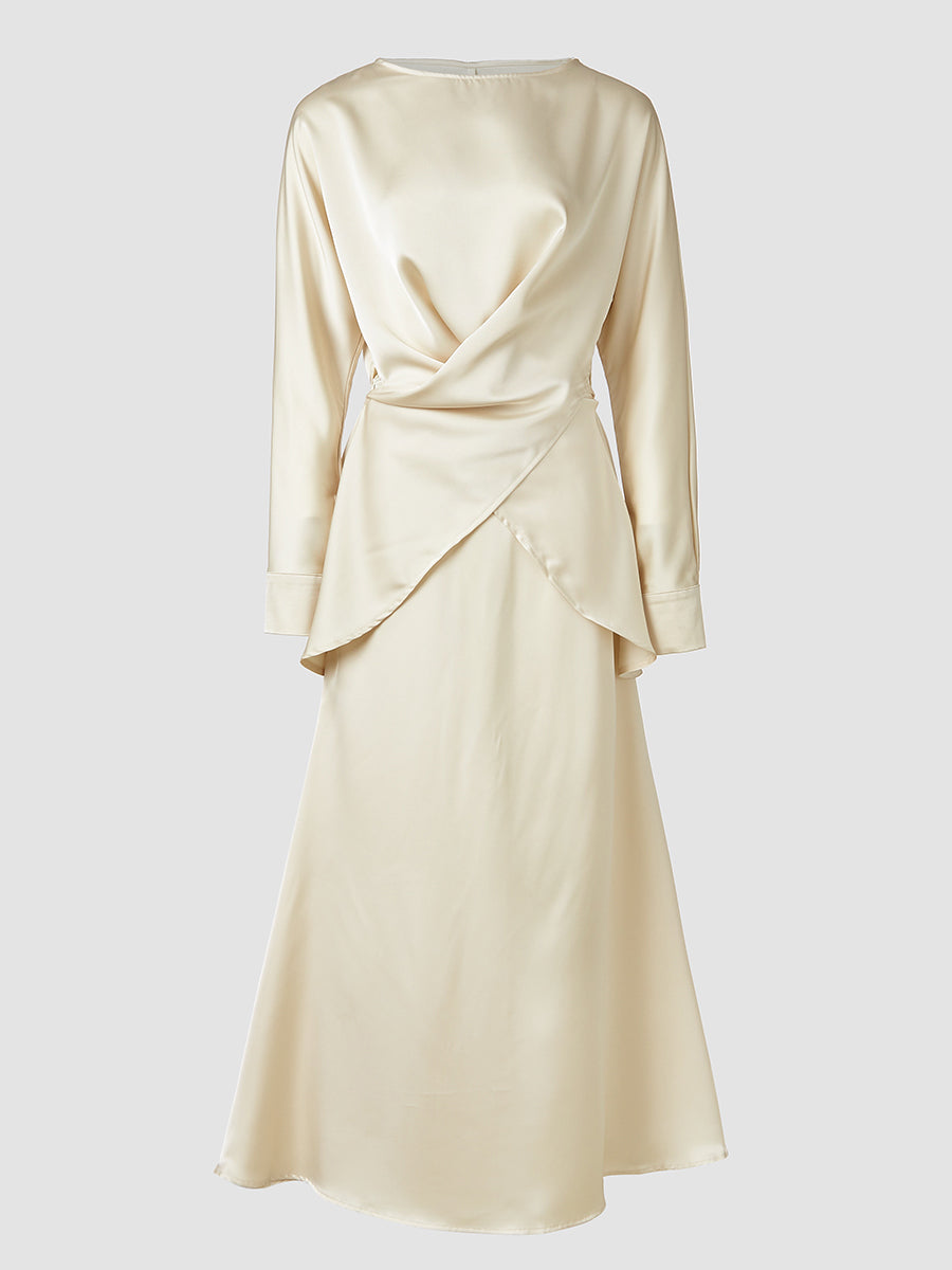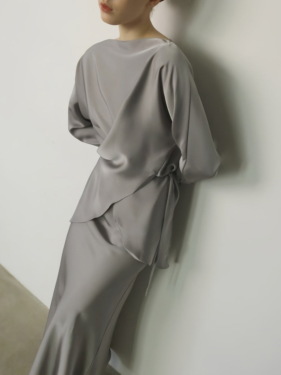 Düz renk, zarif kruvaze bağlama detayıyla fark yaratan bu uzun etek takımı; şık, minimal ve çok yönlü yapısıyla özel davetlerden iş ortamına kadar her anınıza uyum sağlar.
