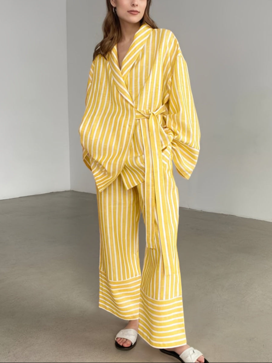 Şal yaka detayı ve yan bağcıklarla tamamlanan bu çizgili pantolon takımı, rahat kesimiyle günlük stilinize enerjik bir dokunuş katıyor. Evde ya da dışarıda özgün tarzınızı yansıtmak için ideal.
