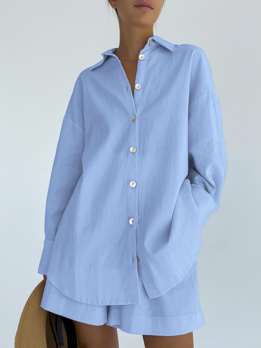 Düz renkli tasarımı, gömlek yaka detayı ve rahat kesimiyle bu uzun kollu şort takımı; hem şık hem konforlu bir stil sunar. Günlük kullanım, ofis sonrası buluşmalar veya hafta sonu planları için çok yönlü bir parça.