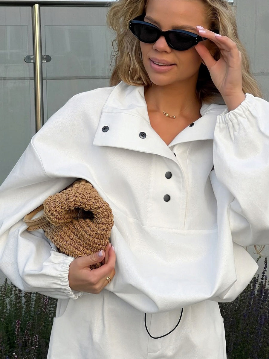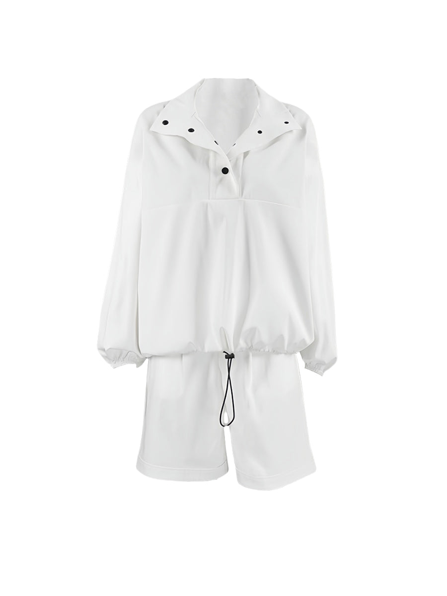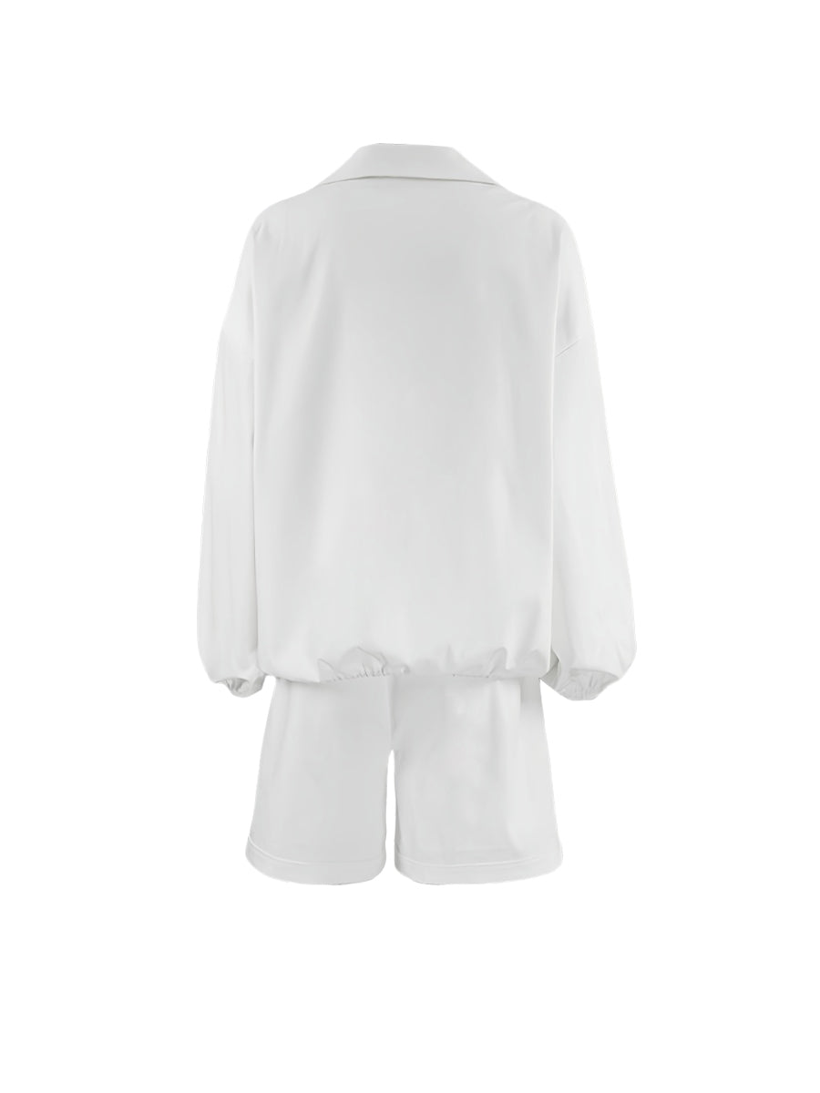Gardırobunuzu bu Düğmeli Uzun Kollu Üst ve Şort Takımı ile tamamlayın. Zahmetsiz şıklık ve konfor için tasarlanmış, nefes alabilen kumaşı sizi serin tutarken, kesimi silüetinizi güzelleştirir. Klasik düğmeli üstün zarafeti, rahat bağcıklı şortlarla buluşuyor.