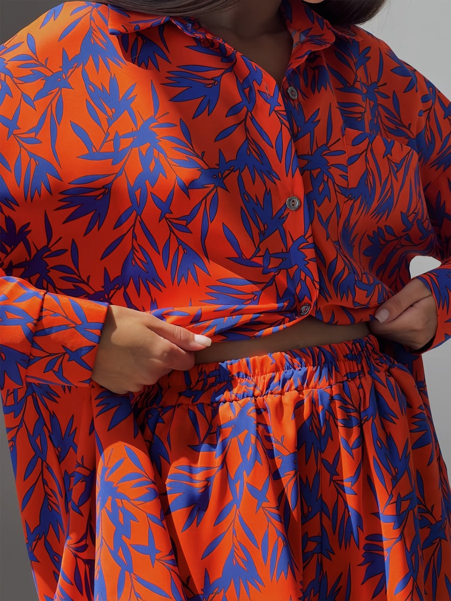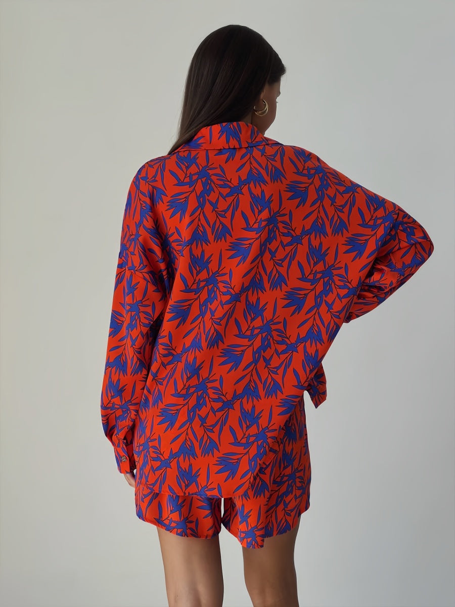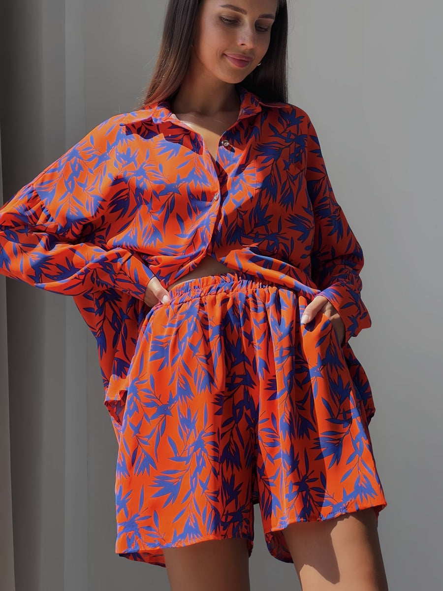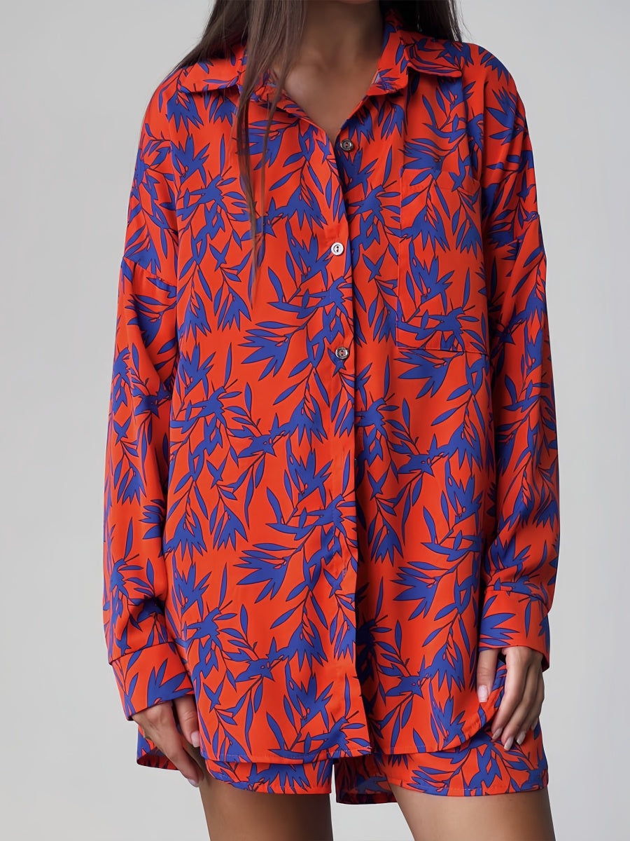 Her türlü günlük kullanım için ideal, yaprak desenli ve düğmeli bu şort takımıyla şıklığı ve rahatlığı yakalayın. Uzun manşetli kollarıyla serin günlerde de sizi sıcak tutar. Gardırobunuza kolaylıkla uyum sağlayacak çok yönlü ve modaya uygun bir set.