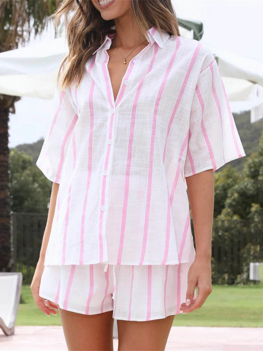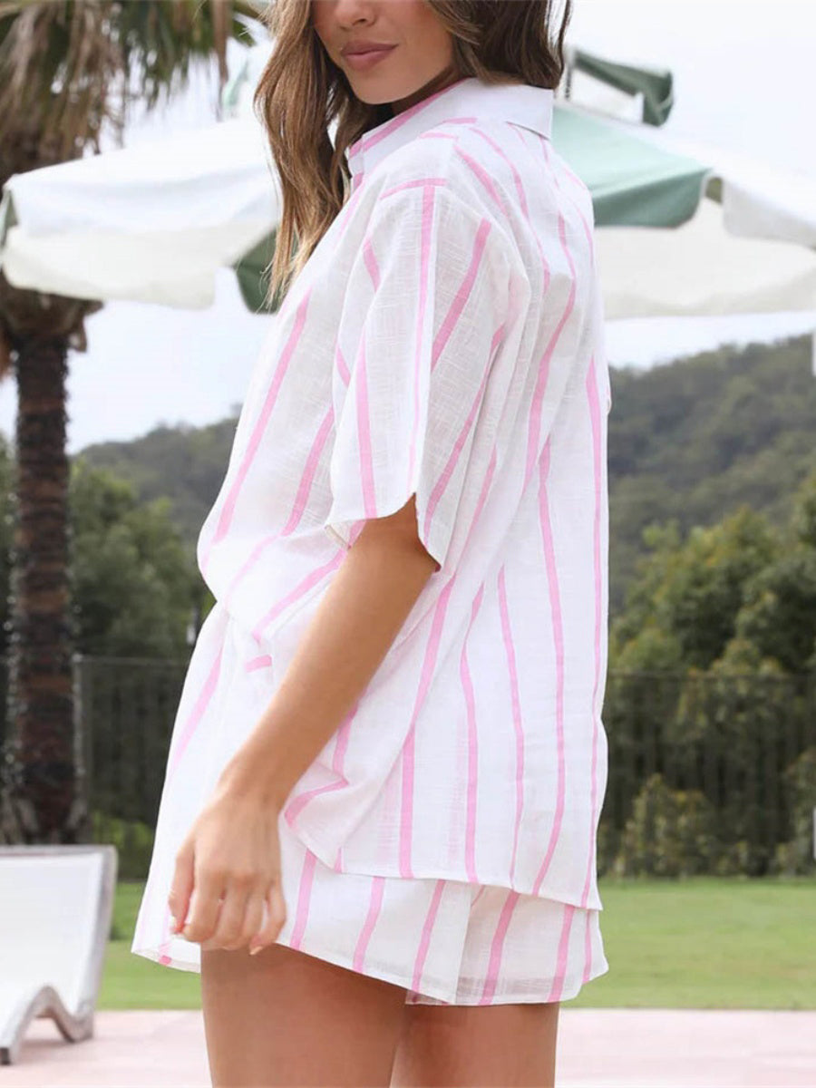 Yaz gardırobunuzu şık ve rahat bir şekilde güncelleyin! Bu çizgili desenli ve düğmeli yarım kollu şort takımı, sıcak havalar için ideal bir seçim. Ayarlanabilir bel ipi sayesinde mükemmel uyum sağlar ve gün boyu serin kalmanızı destekler. Hem gündelik hem tatil stilinize uyum sağlayacak çok yönlü ve trend bir parça.