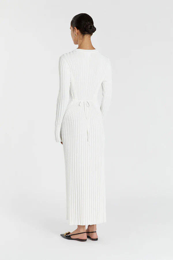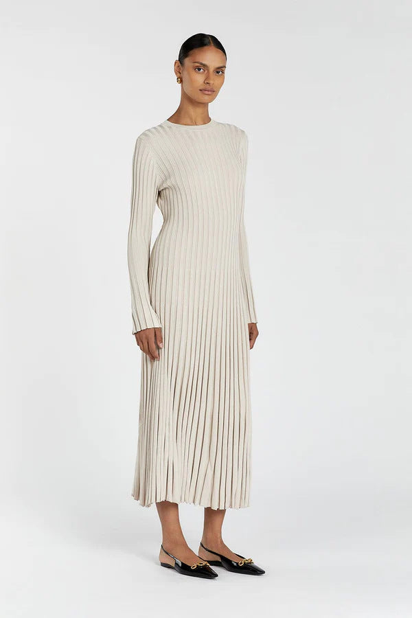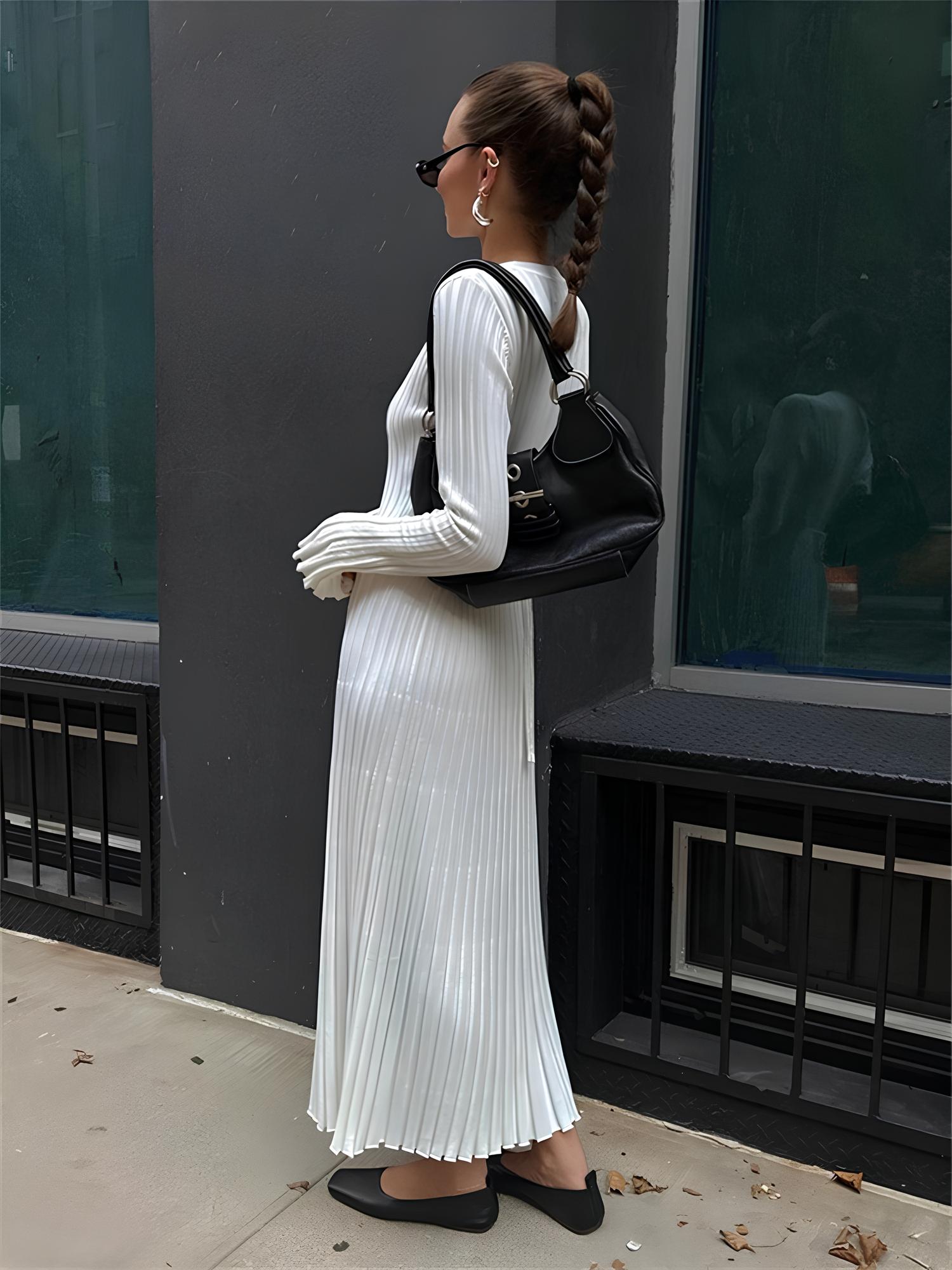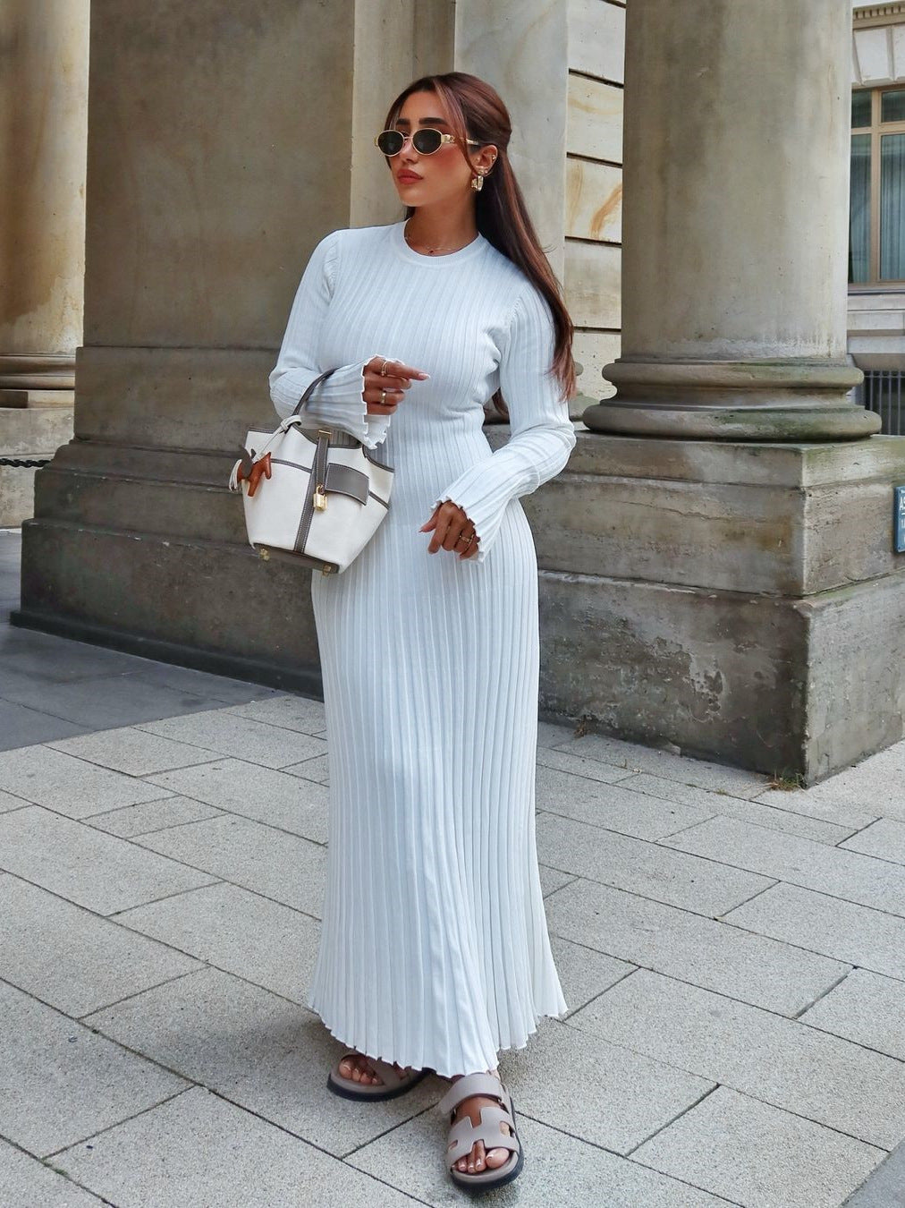 Minimal şıklığın zamansız hali. Aria Fitilli Triko Maxi Elbise, konforu ve zarafeti tek parçada buluşturuyor. Uzun kollu tasarımı ve yuvarlak yaka detayıyla sadeliği ön plana çıkarırken, fitilli dokusu vücudu zarifçe saran feminen bir silüet sunar.