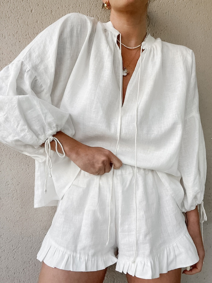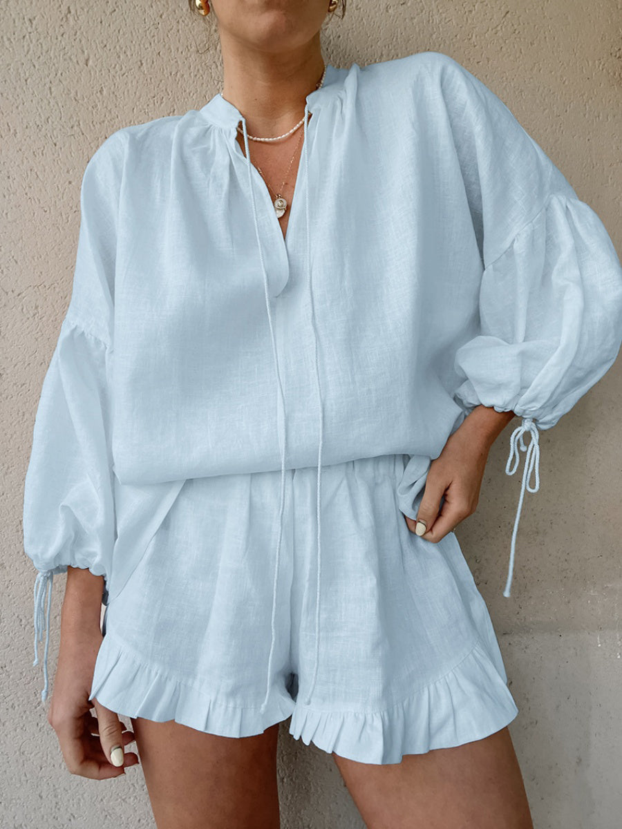 Günlük rahatlığınızı şıklıkla buluşturun! Şort Takımımız, dikkat çekici V yakası ile yukarıya doğru zarif bir görünüm yaratırken, narin fırfırlar şortlara feminen bir dokunuş katıyor. Hem konfor hem de tarz için tasarlanan bu çok yönlü takım, tembel sabahlardan günlük dışarı çıkışlara kadar her anınıza uyum sağlar.