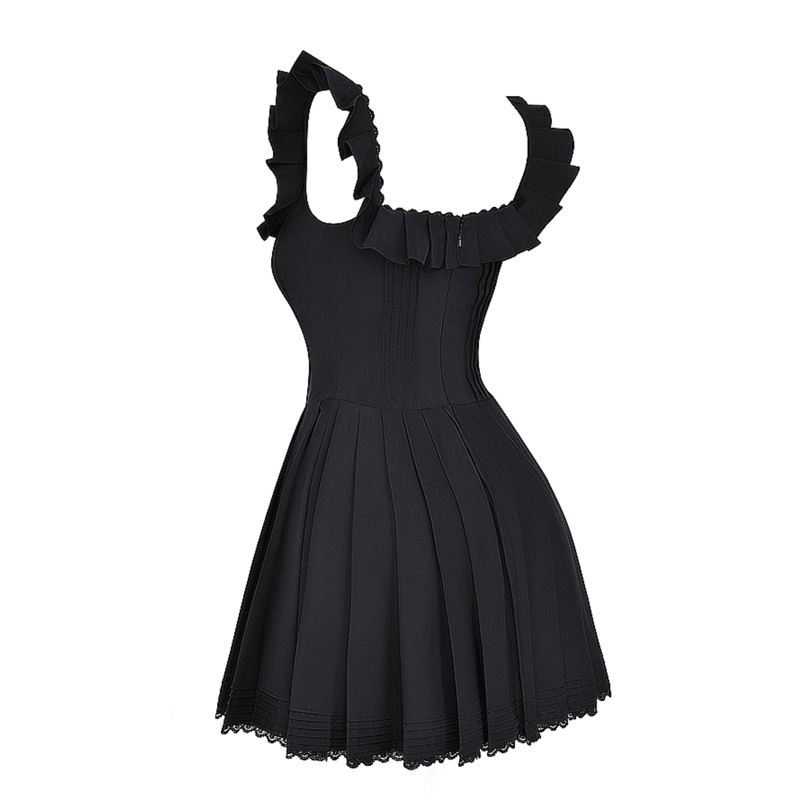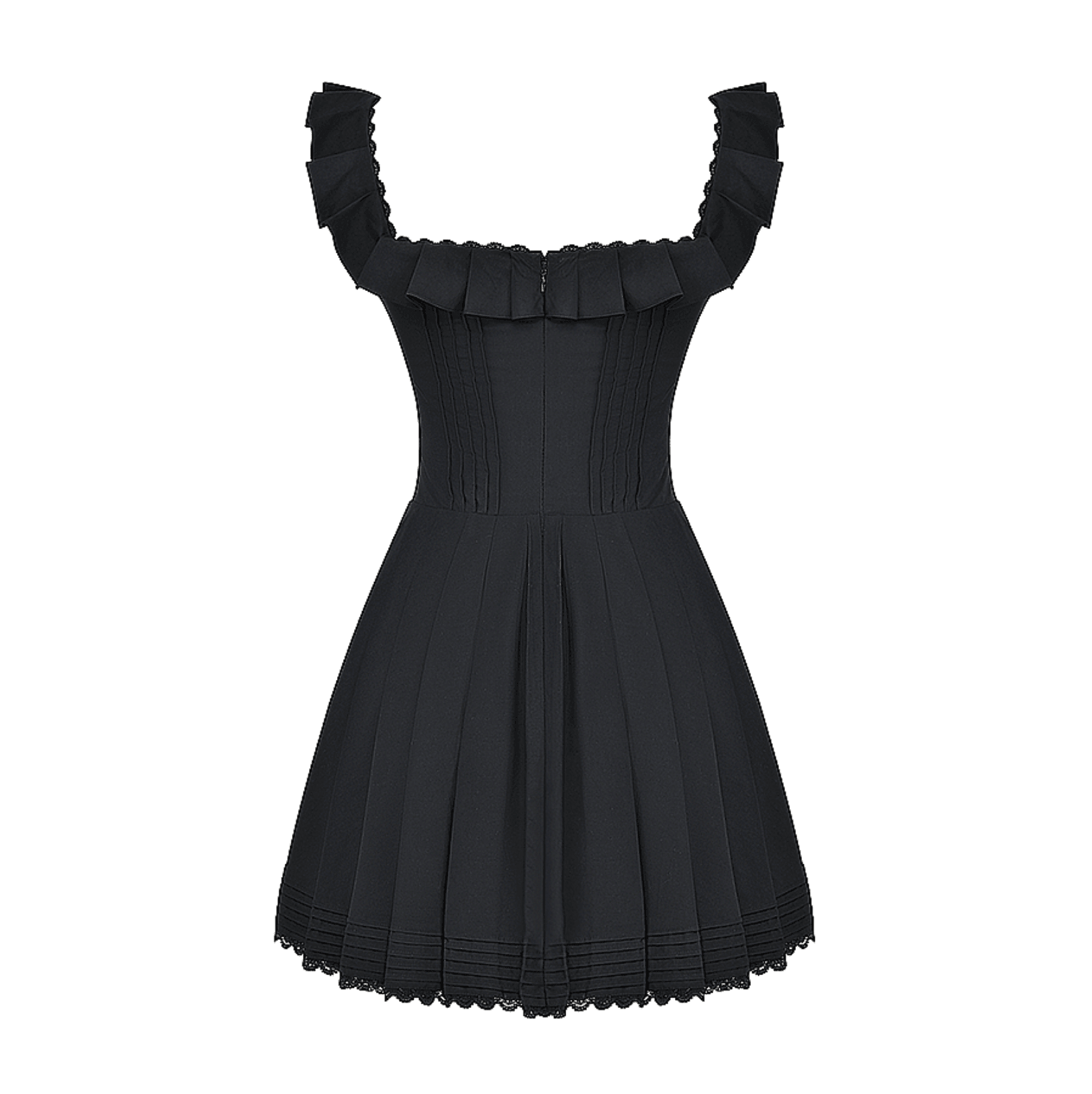 Siyahın sofistike etkisi, pliseli etek ucu ve dantel garnitürleriyle birleşerek göz alıcı bir şıklık sunar. Kare yaka kesimi ve askılardaki fırfır dokunuşları ise modern çizgiye romantik bir hava katar.