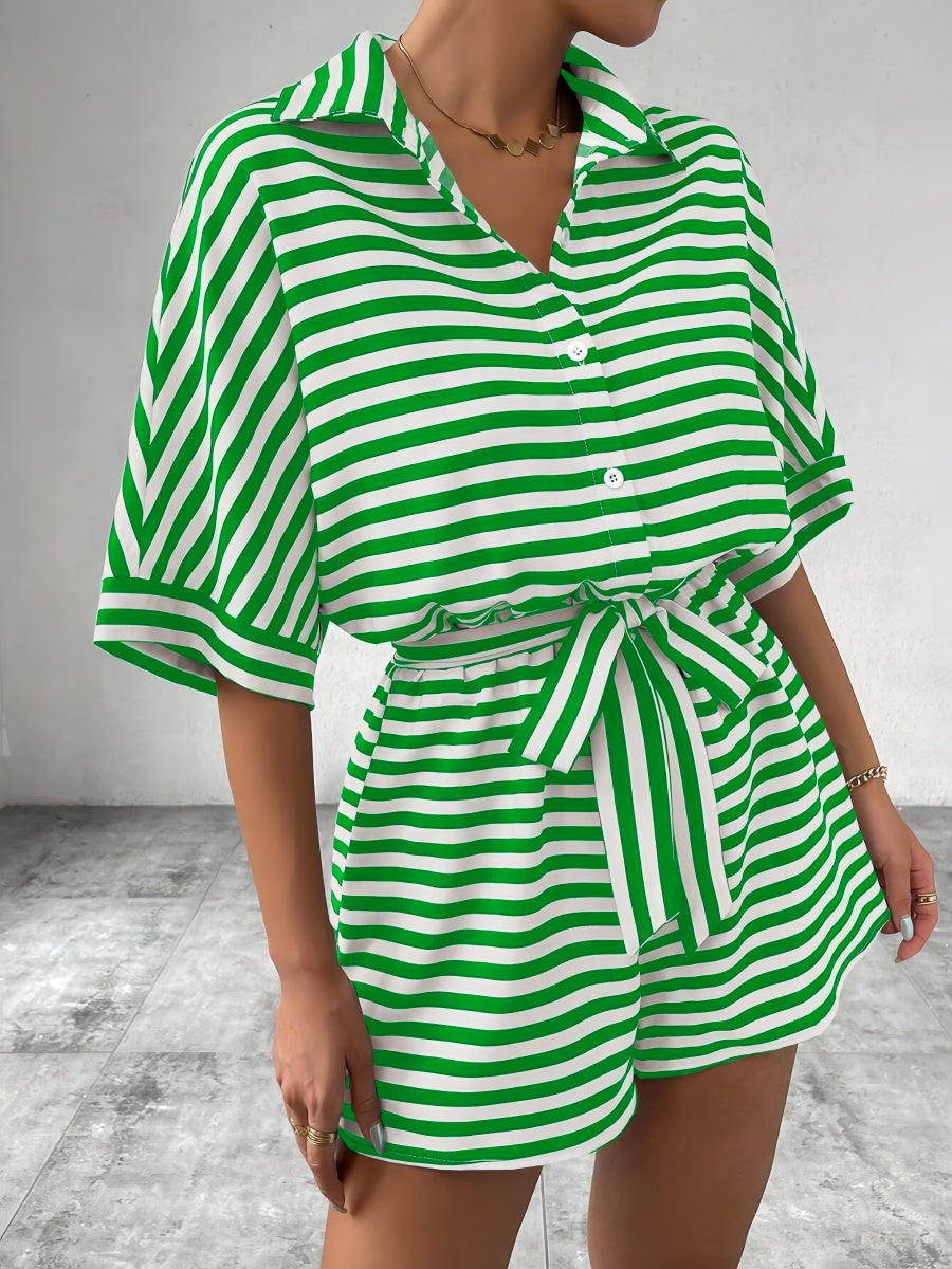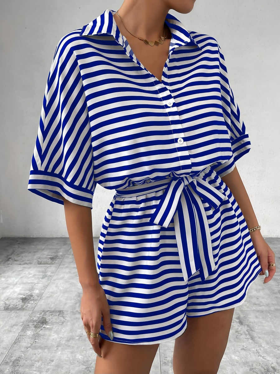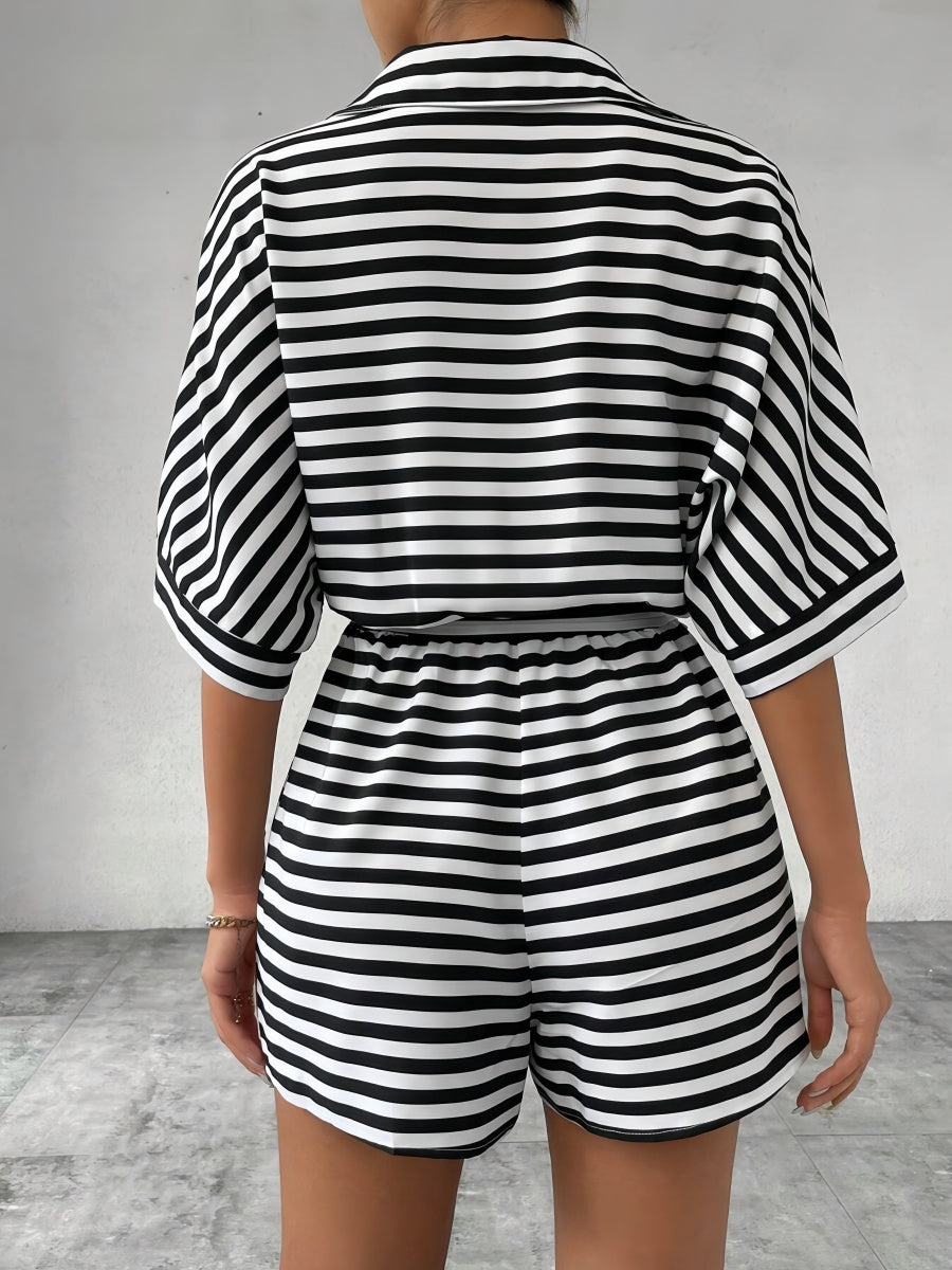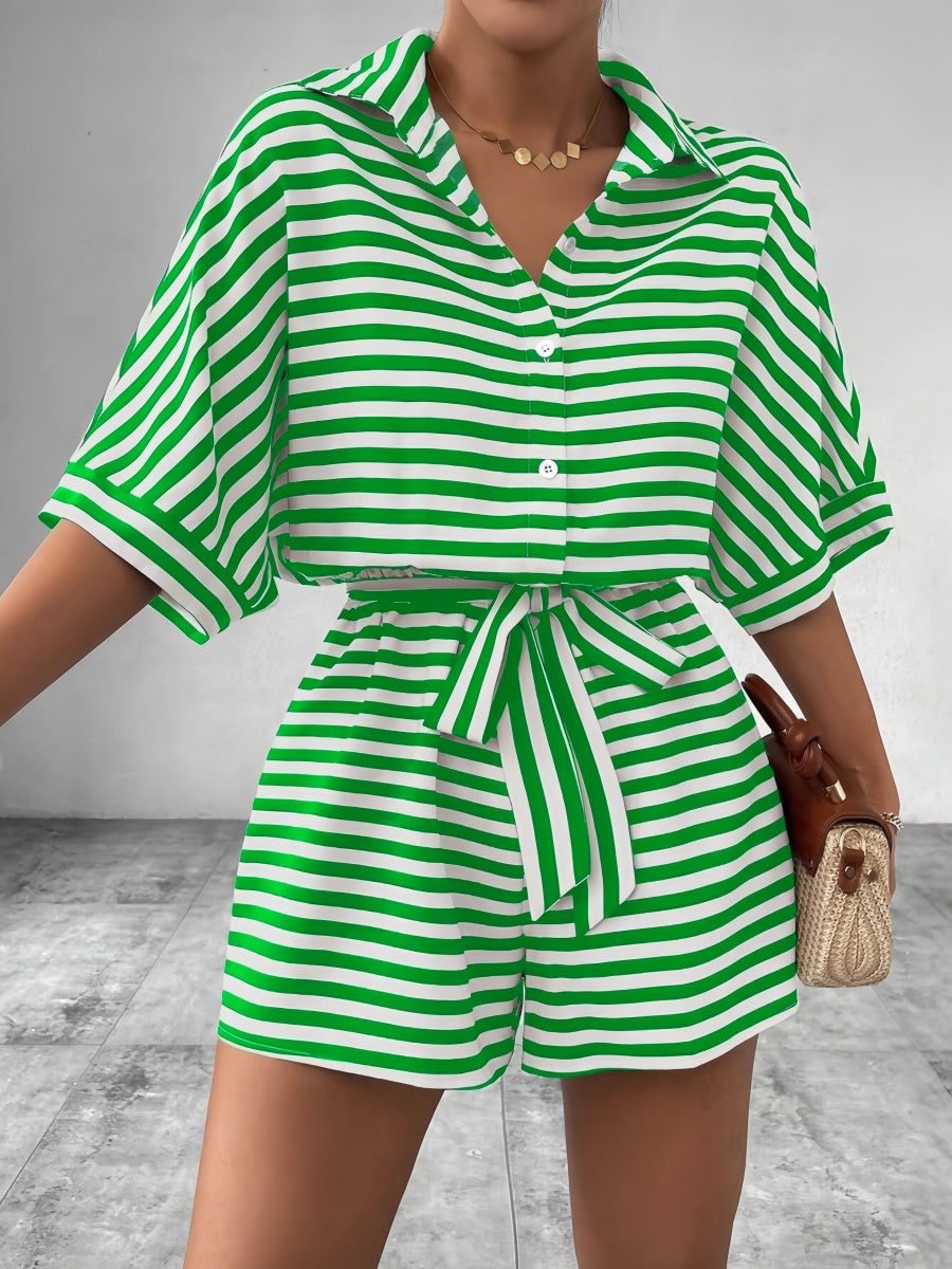 Moda tutkunları için vazgeçilmez bir parça: Çizgili Desenli Yarım Kollu Romper! Canlı çizgili deseni ve rahat yarım kollu tasarımıyla hem dikkat çekici hem de konforlu. İster partiye ister gündüz gezmelerine giderken stilinizi yükseltin, özgüvenle parlayın.